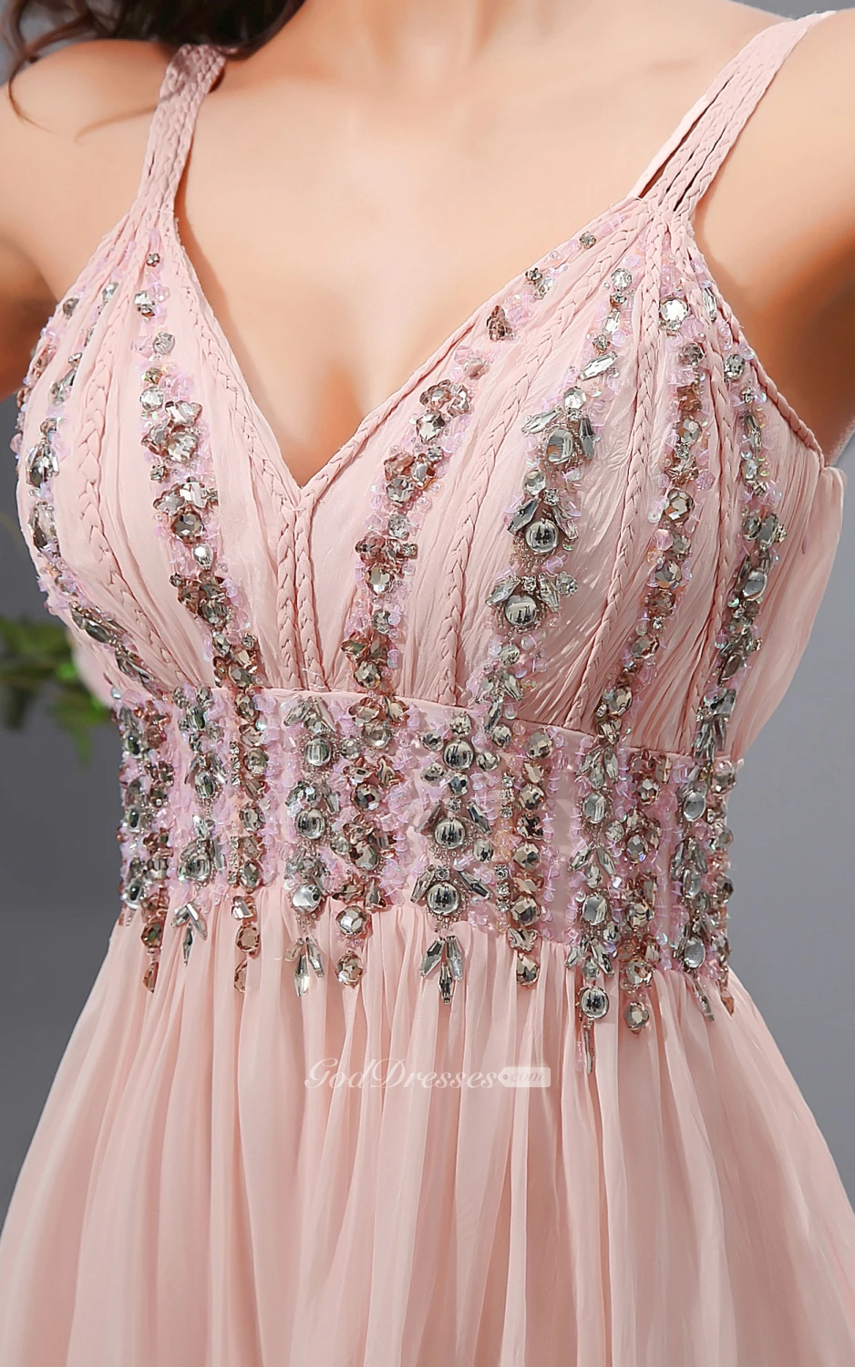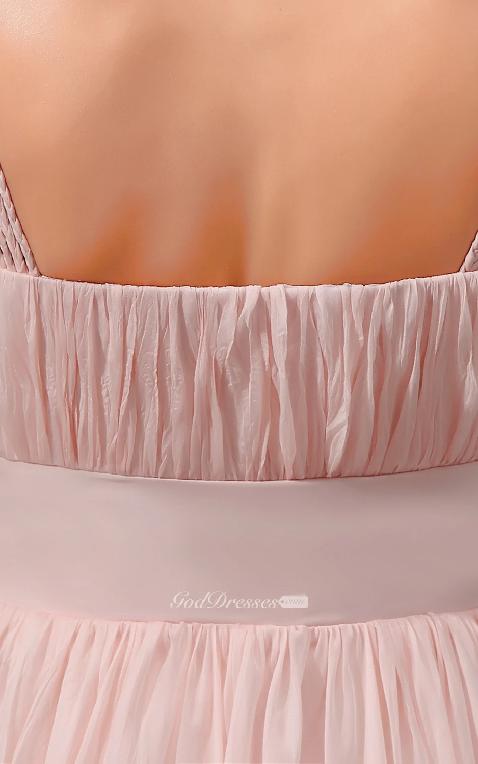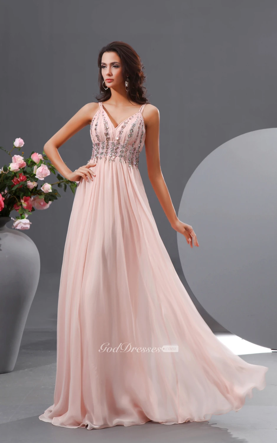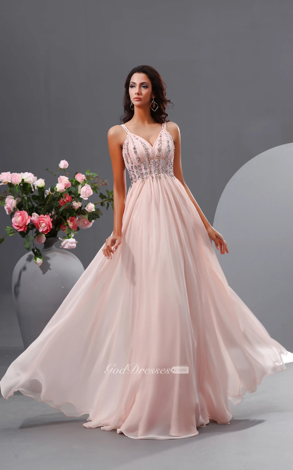 Sweet V-Neck Empire A-Line Chiffon Gown Spaghetti Straps Shiny Bodice