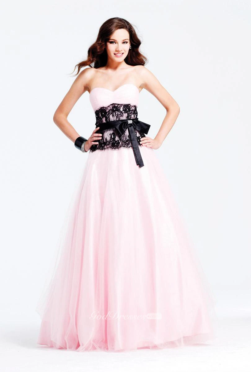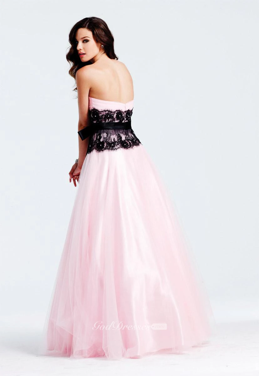 Sweetheart Black Lace Prom Dresses With Hot Bridalsmaid Pink Pleated Tulle Bow Ruffle Gown