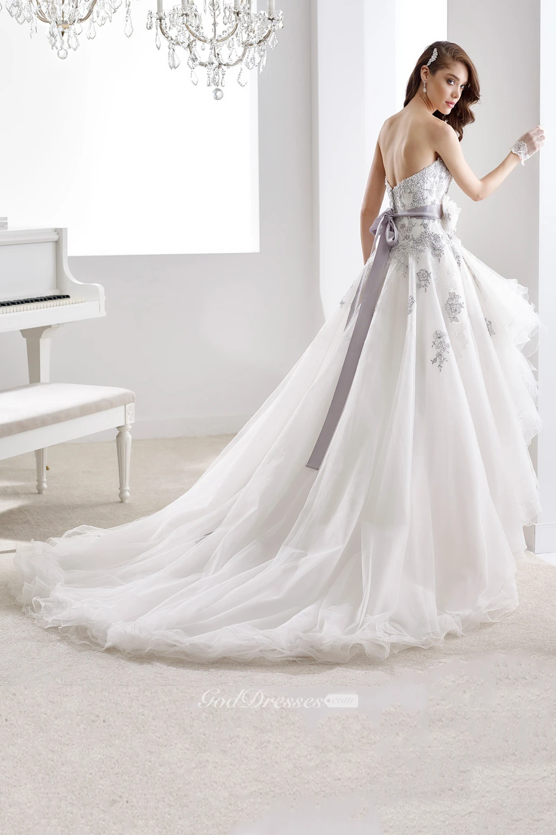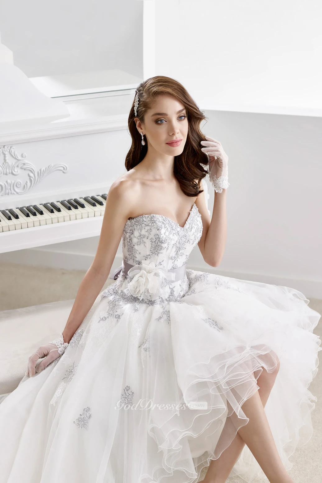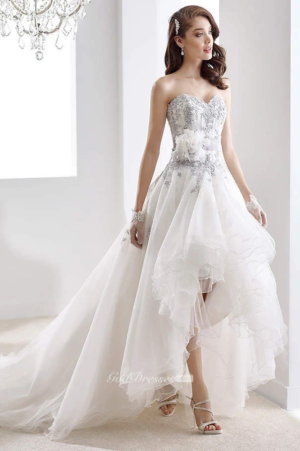 Sweetheart High-Low Beaded Gown With Ruffles And Floral Decoration