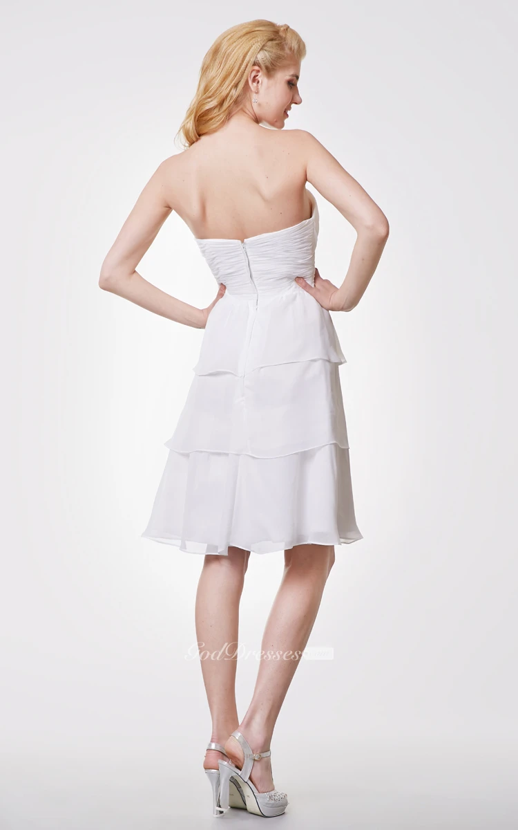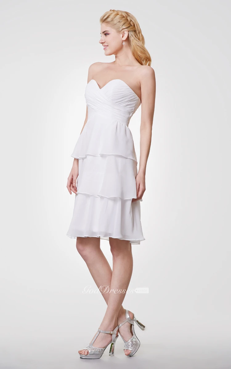 Achieve a classic bridal party look with this stunning strapless layered a-line chiffon knee-length dress. A figure flattering fitted bodice is accented by a dramatic tiered layered chiffon skirt that hits just above the knee. The modern sweetheart style neckline is accented by delicate ruching in an edgy crisscross style for a chic traditional look that is perfect for any fashion-forward wedding.
