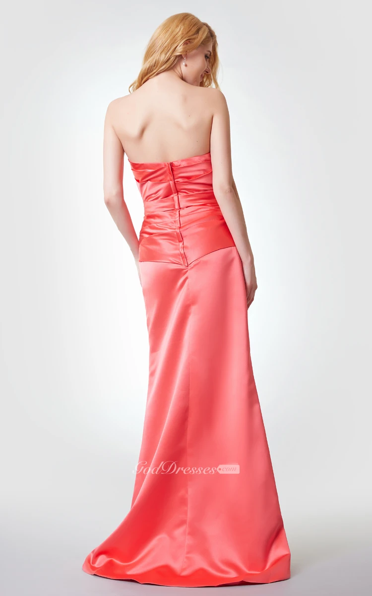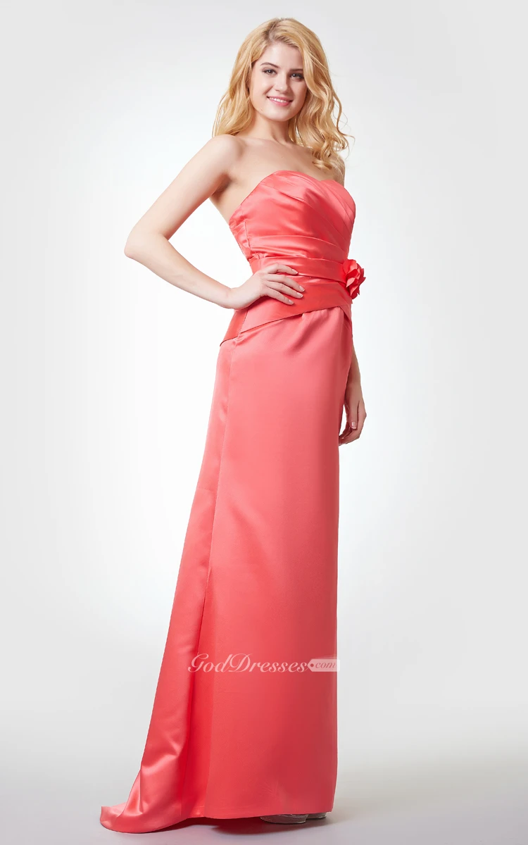 Sweetheart Ruched A-line Long Satin Dress With Flower