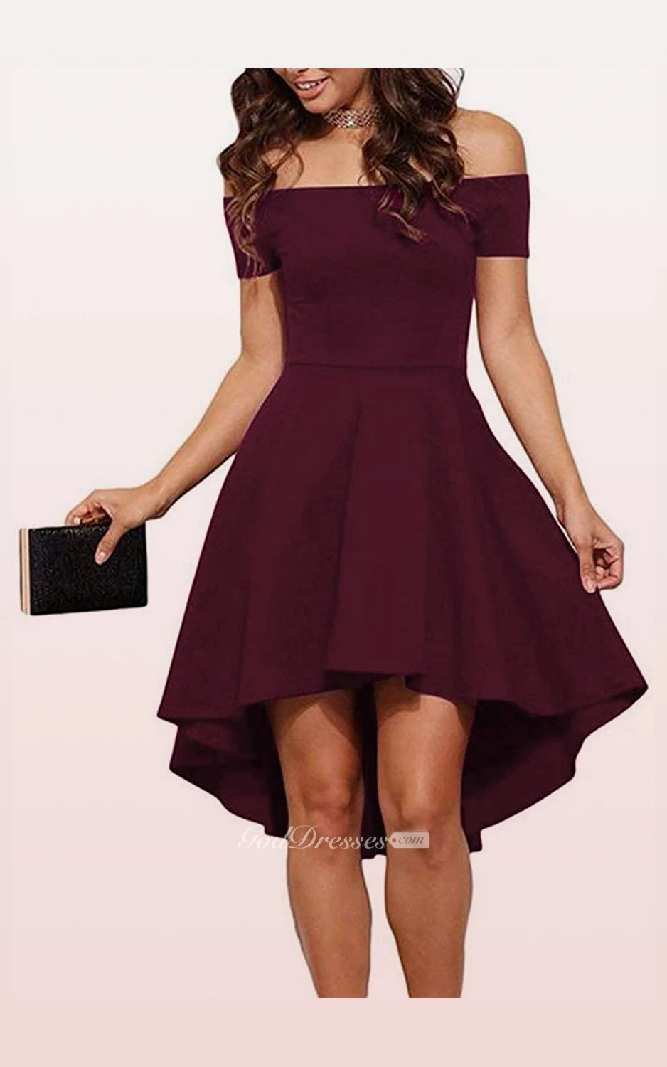 Taffeta Short High-Low A Line Short Sleeve Modern Solid Dress with Pleats