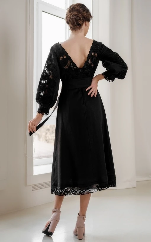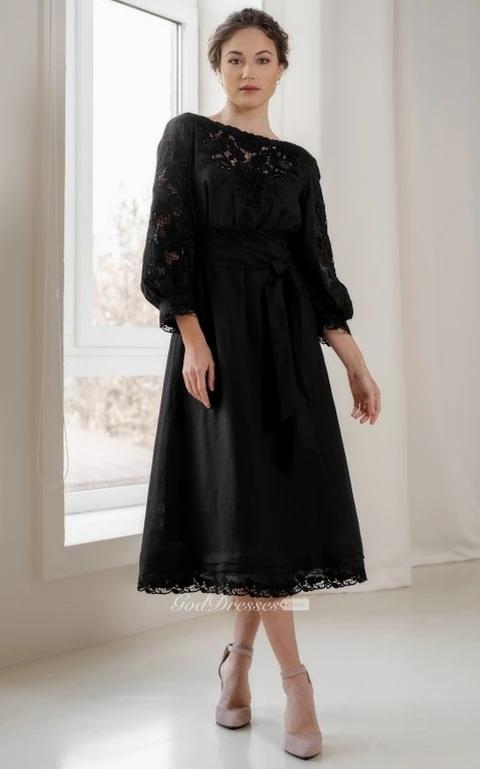 Tea-length A Line Bohemian Bateau Evening Dress with Sash