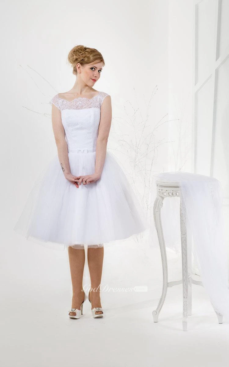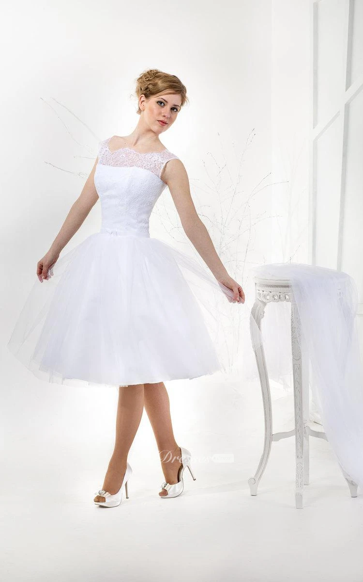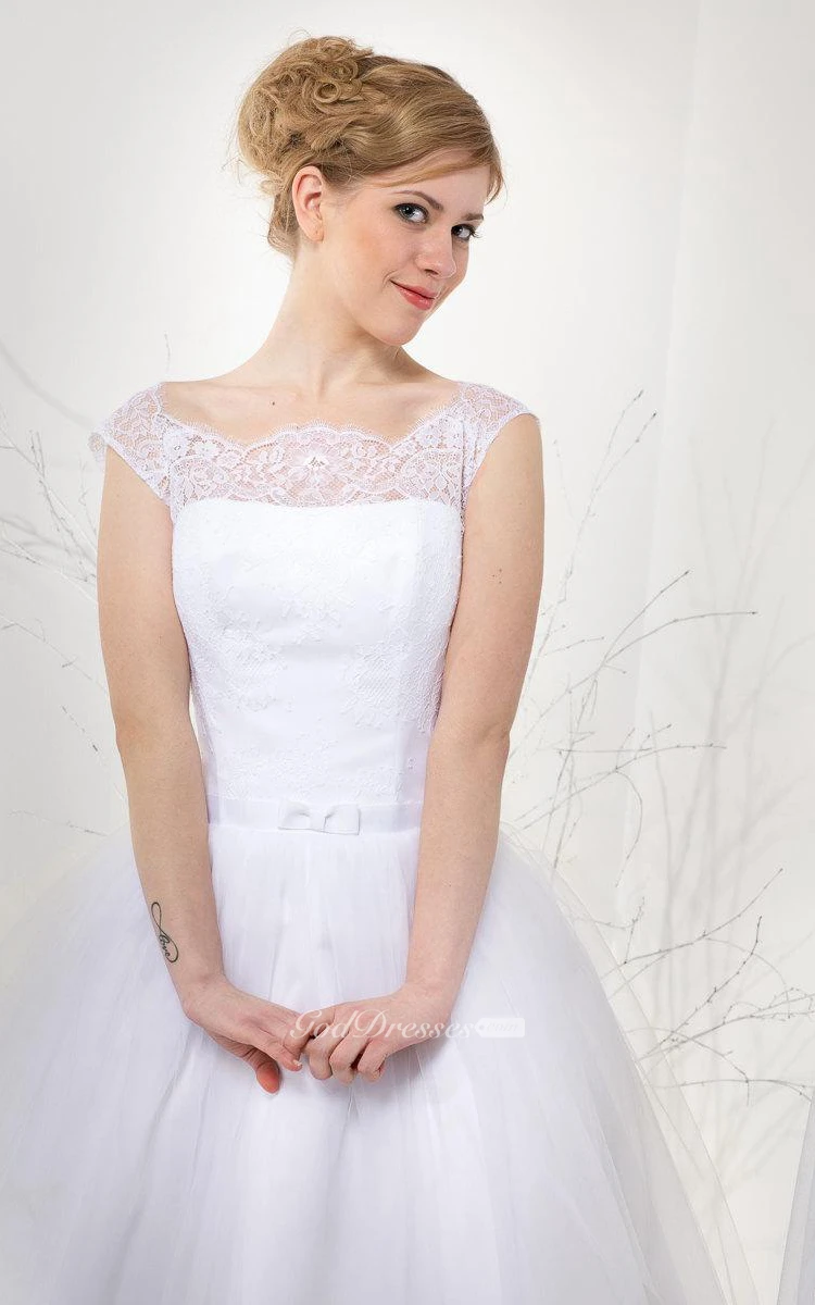 Tea Length A-Line Short Sleeve Tulle Gown With Lace Bodice