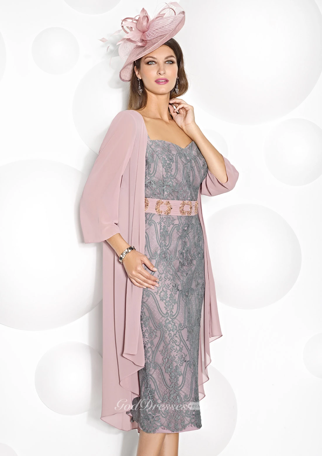 Tea-Length Appliqued 3-4 Sleeve Scoop Neck Chiffon Mother Of The Bride Dress