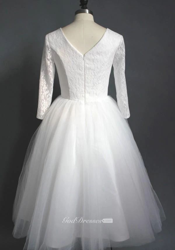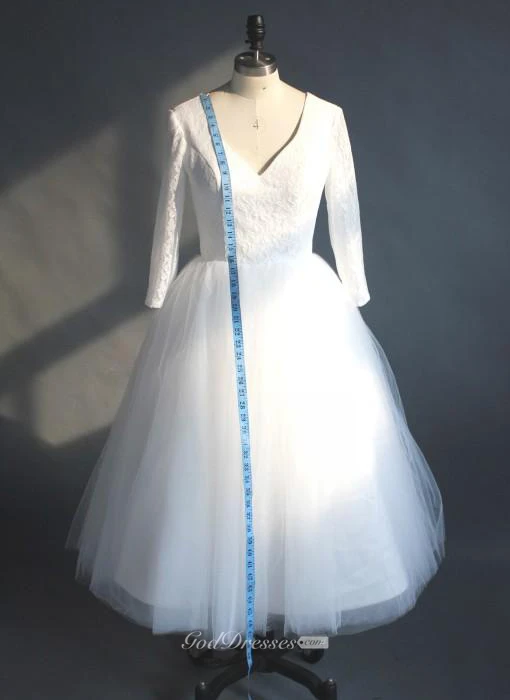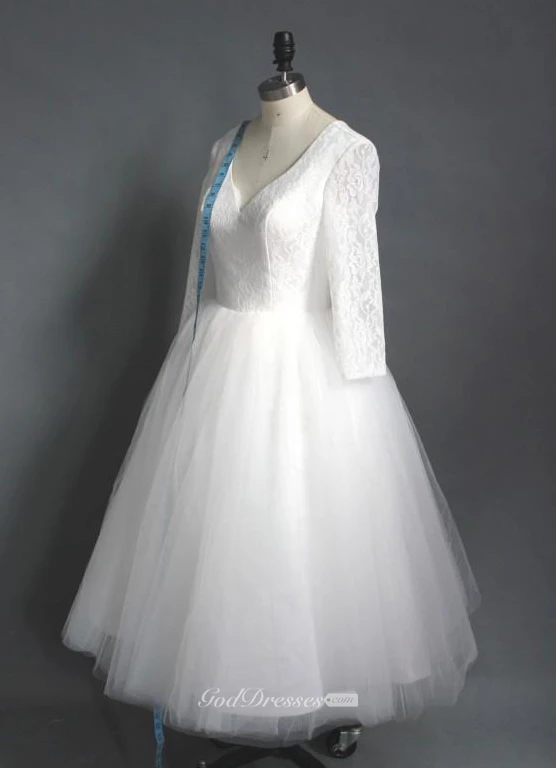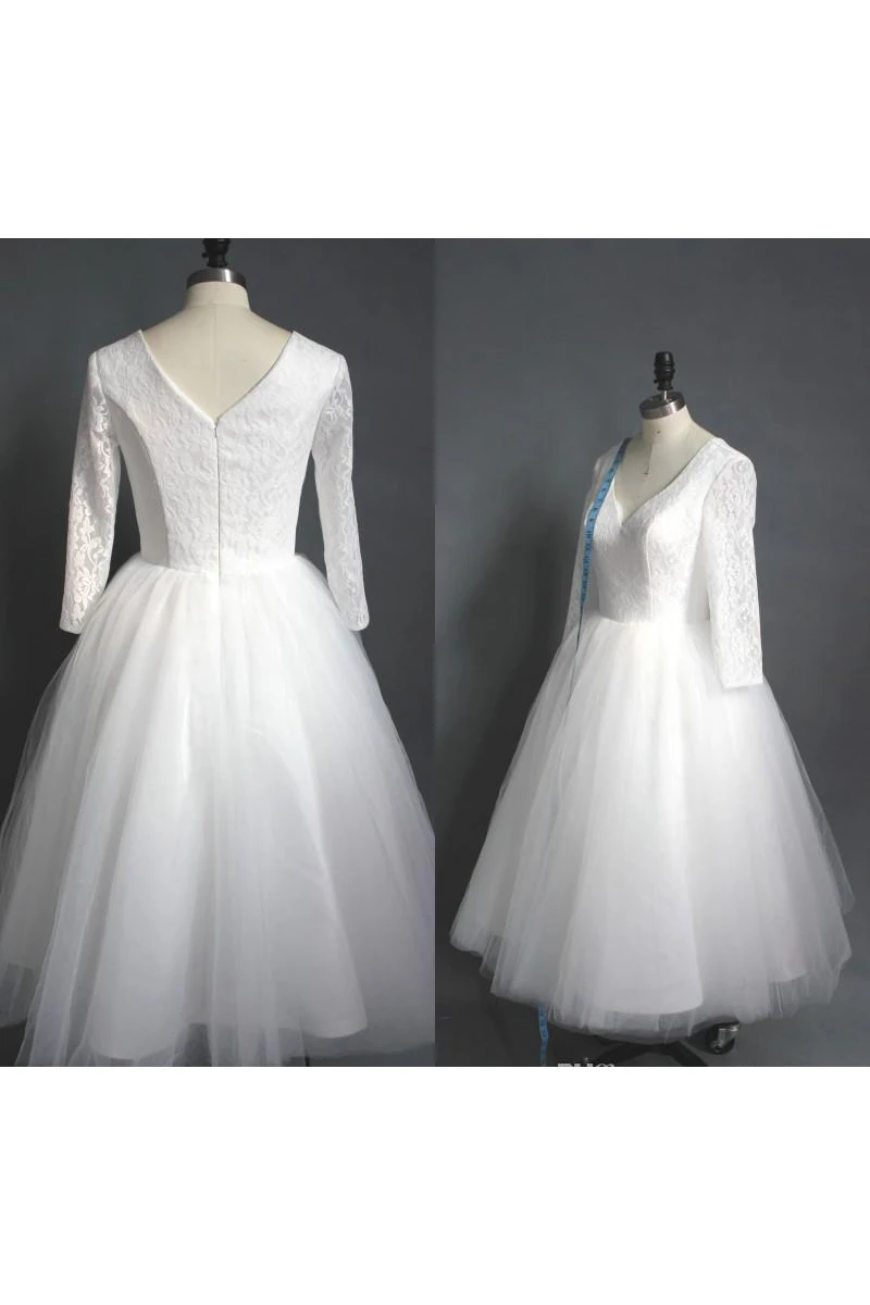 Tea Length High Quality A-line V Neck Lace Top Puffy Tulle Short Wedding Dress with Sleeves