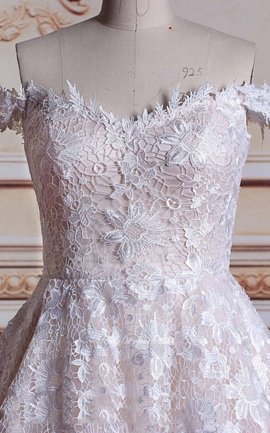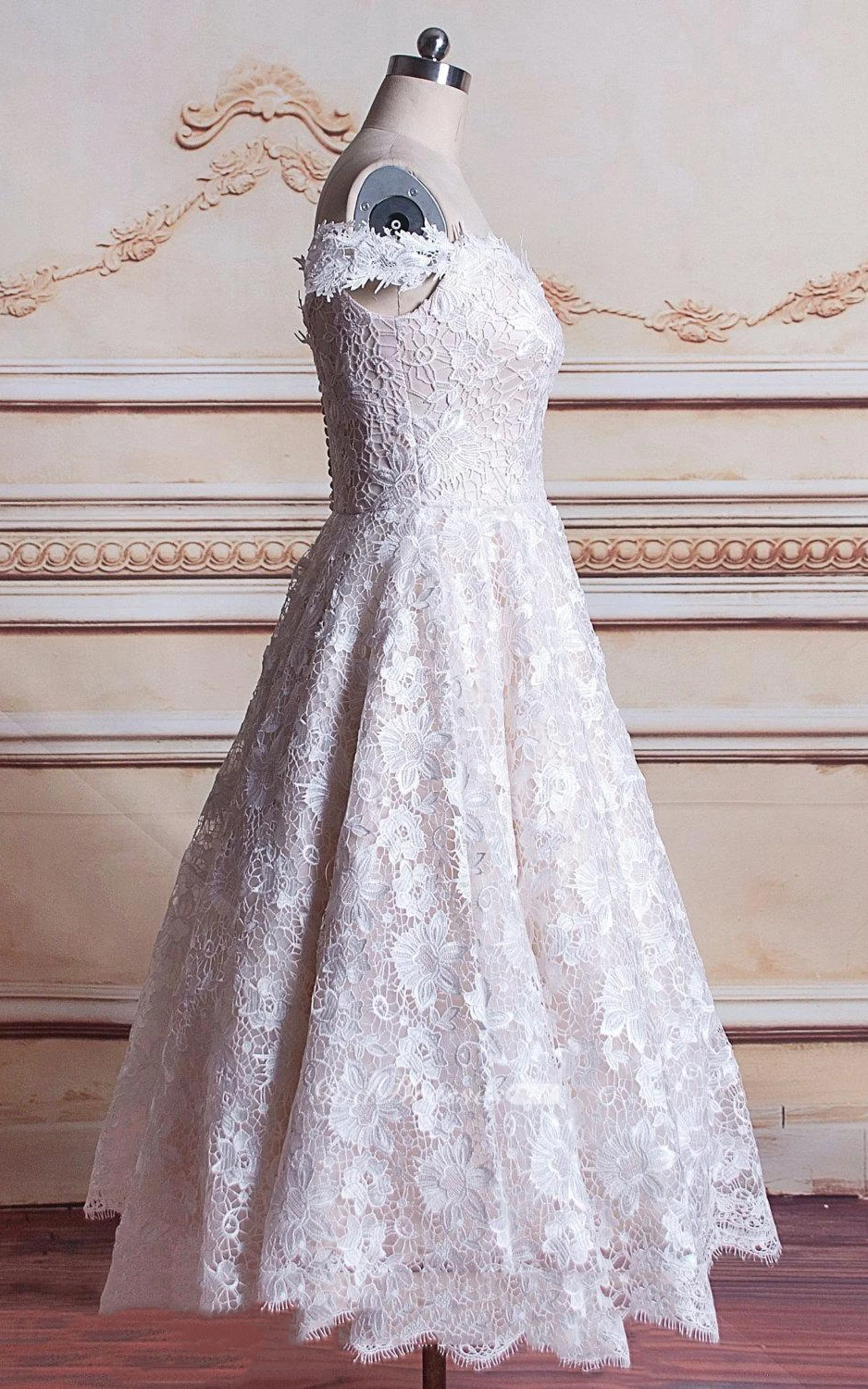 Tea-Length Off-The-Shoulder Tulle Lace Satin Weddig Dress