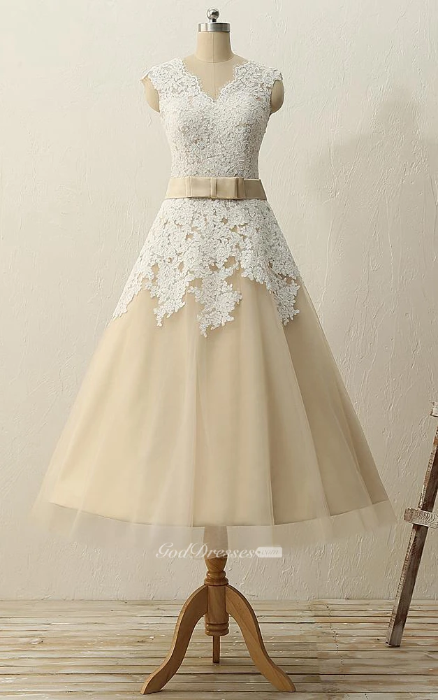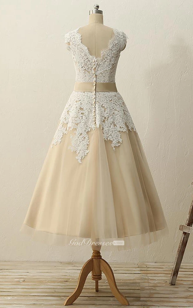 Tea-Length V-neck Zipper Tulle Lace Satin Dress