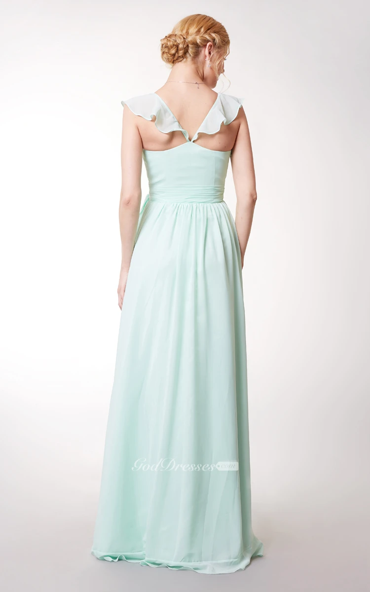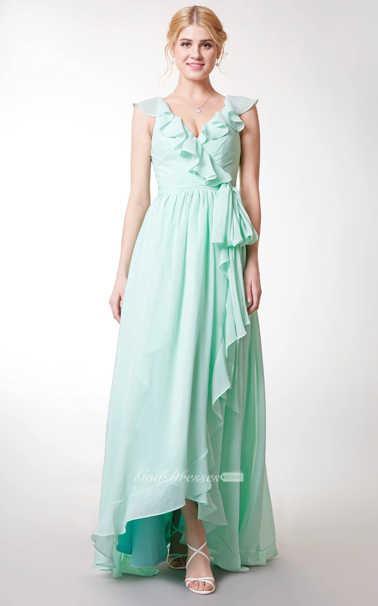 Tiered Short Sleeve V Neck Chiffon Gown With Draping