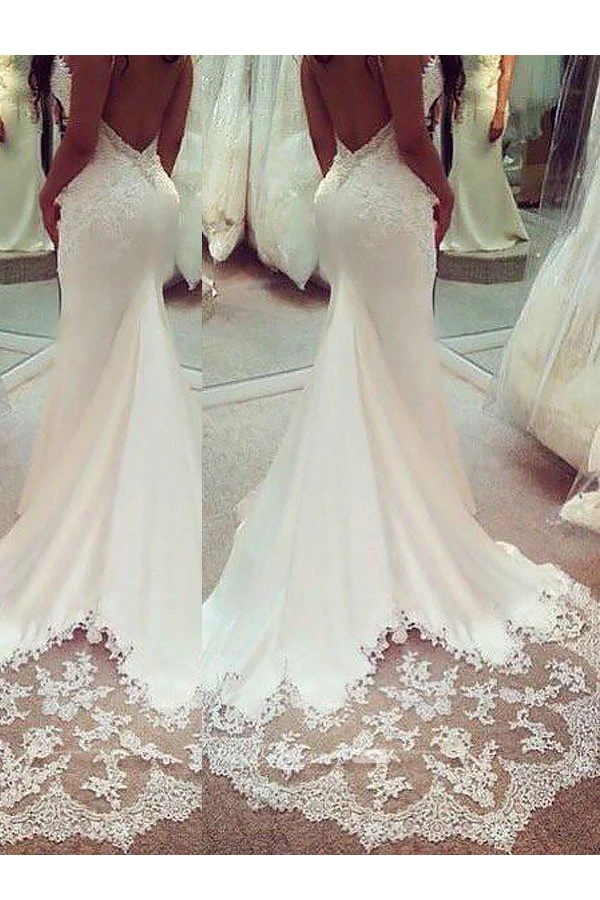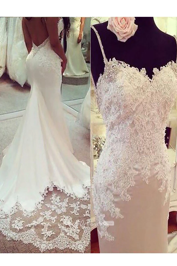 Trumpet Applique Spaghetti Straps Sleeveless Court Train Wedding Dresses