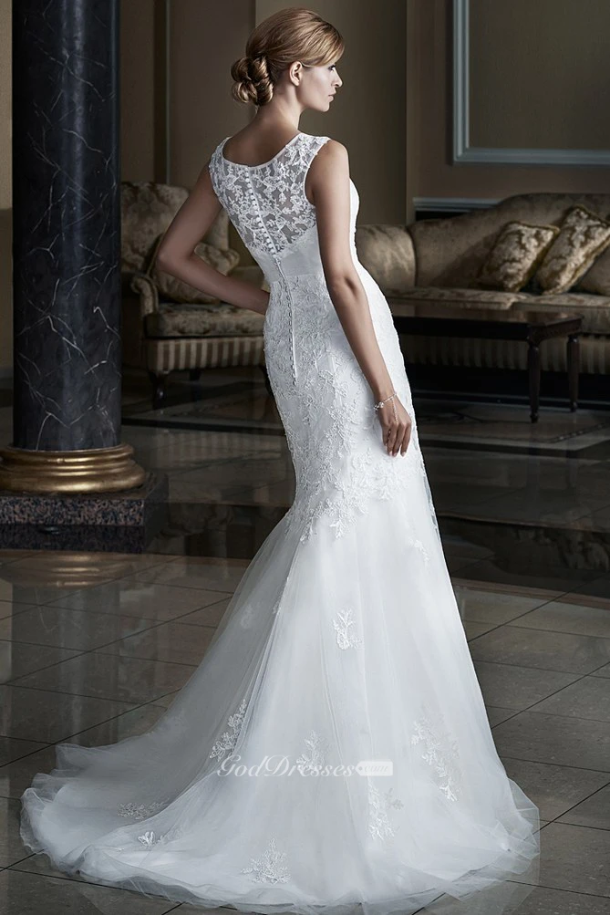 Trumpet Appliqued Scoop-Neck Long Sleeveless Tulle&Lace Wedding Dress