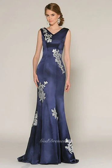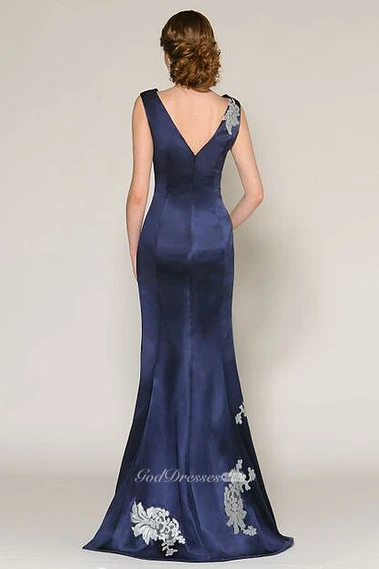 Trumpet Appliqued Sleeveless V-Neck Long Satin Prom Dress