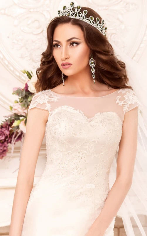 Trumpet Floor-Length Bateau Cap-Sleeve Deep-V-Back Satin Dress With Appliques