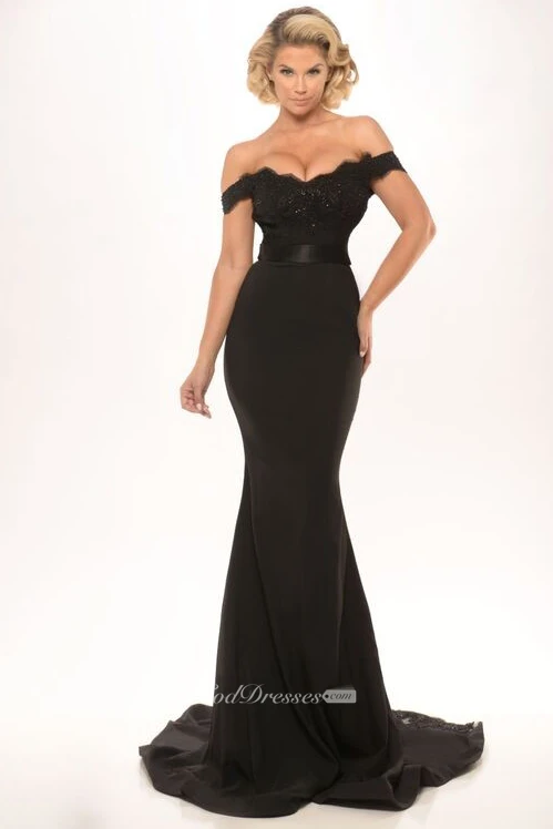 Trumpet Floor-Length Off-The-Shoulder Appliqued Jersey Prom Dress With Backless Style And Lace
