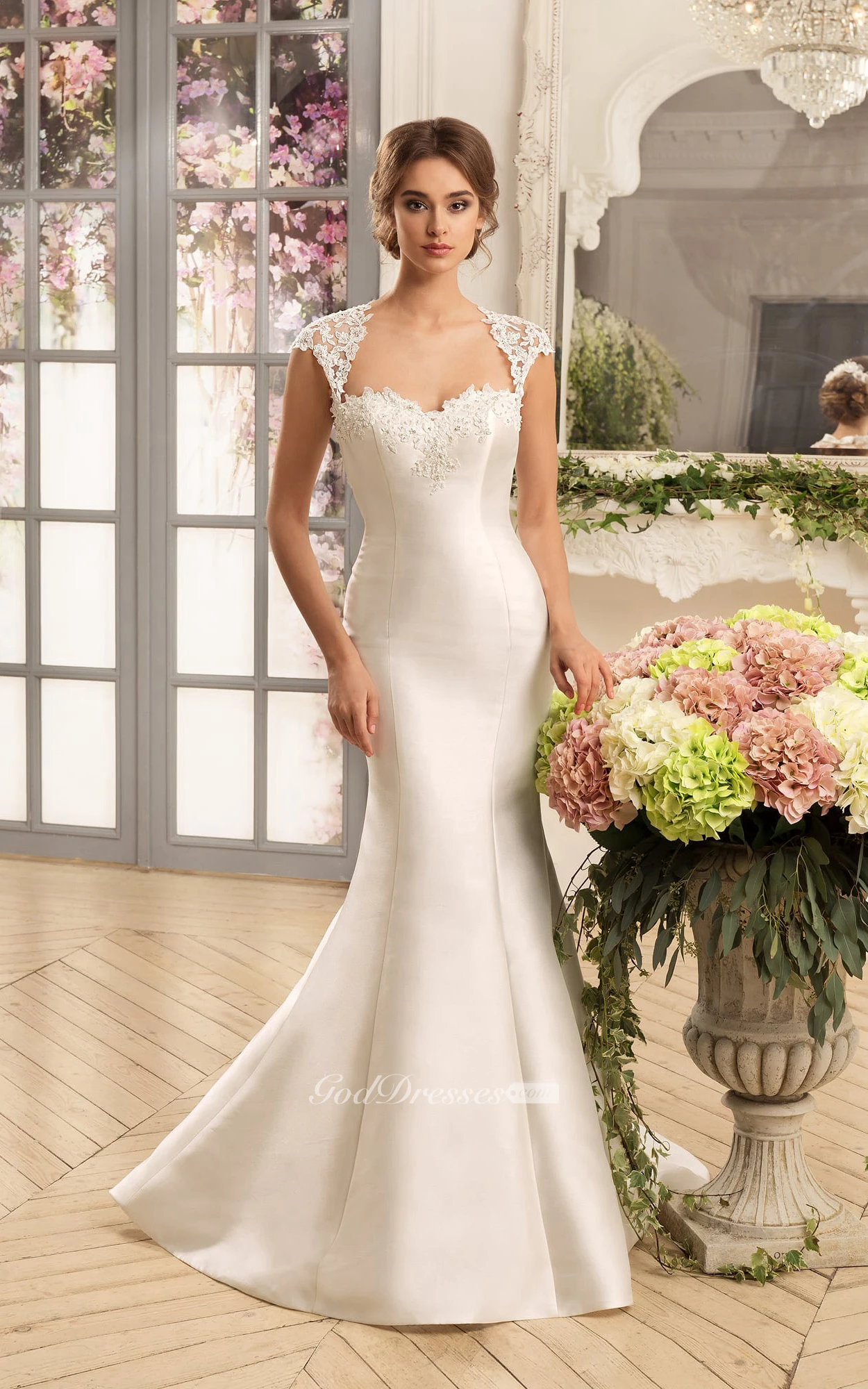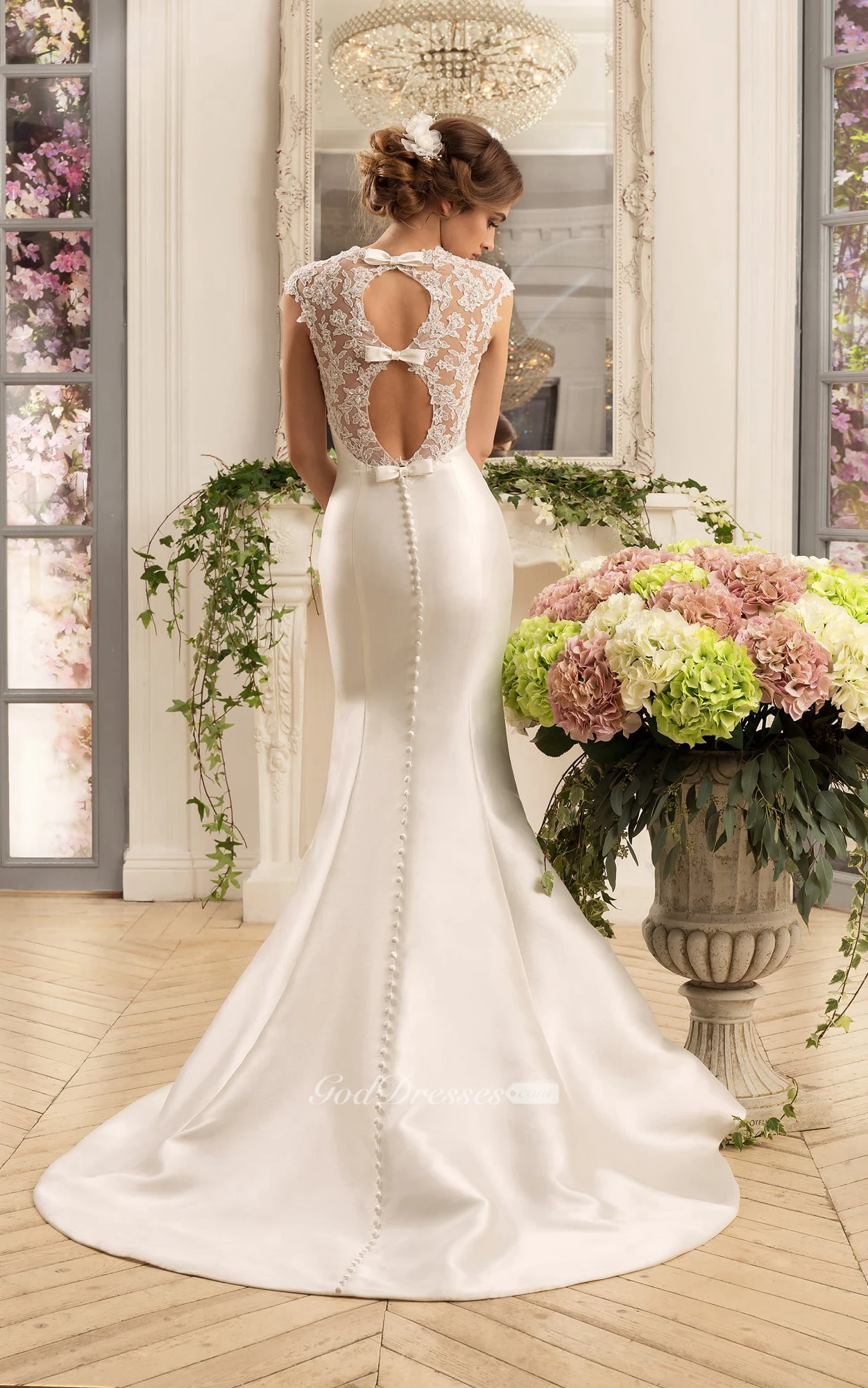 Trumpet Floor-Length Queen-Anne Cap-Sleeve Keyhole Satin Dress With Lace