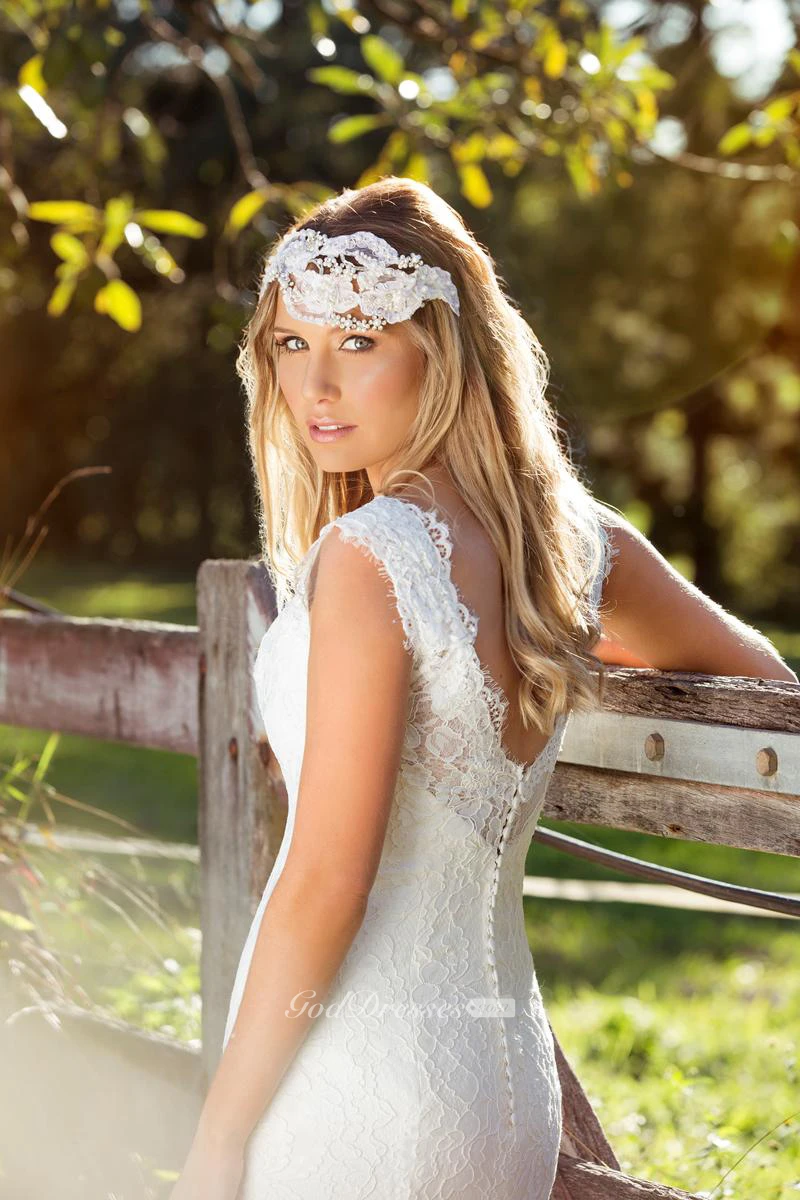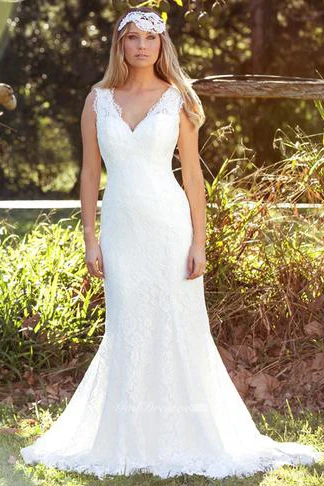 Trumpet Floor-Length Sleeveless V-Neck Lace Wedding Dress With V Back