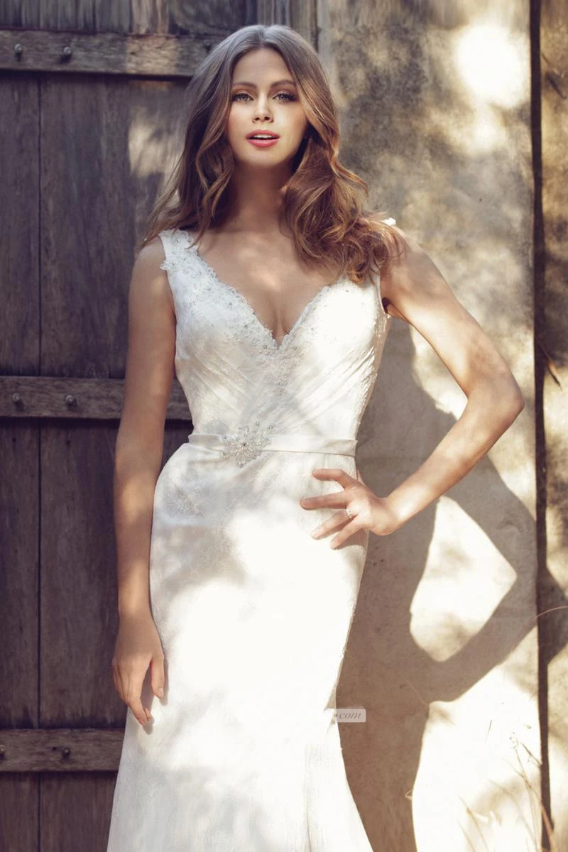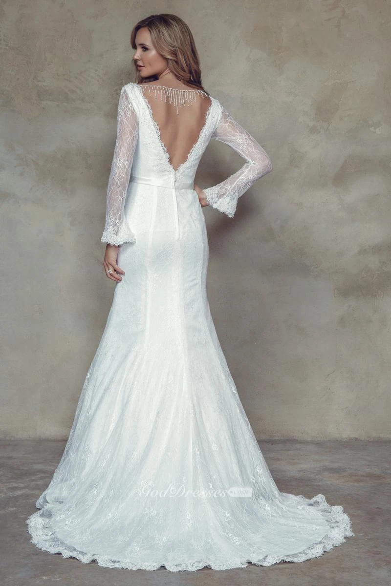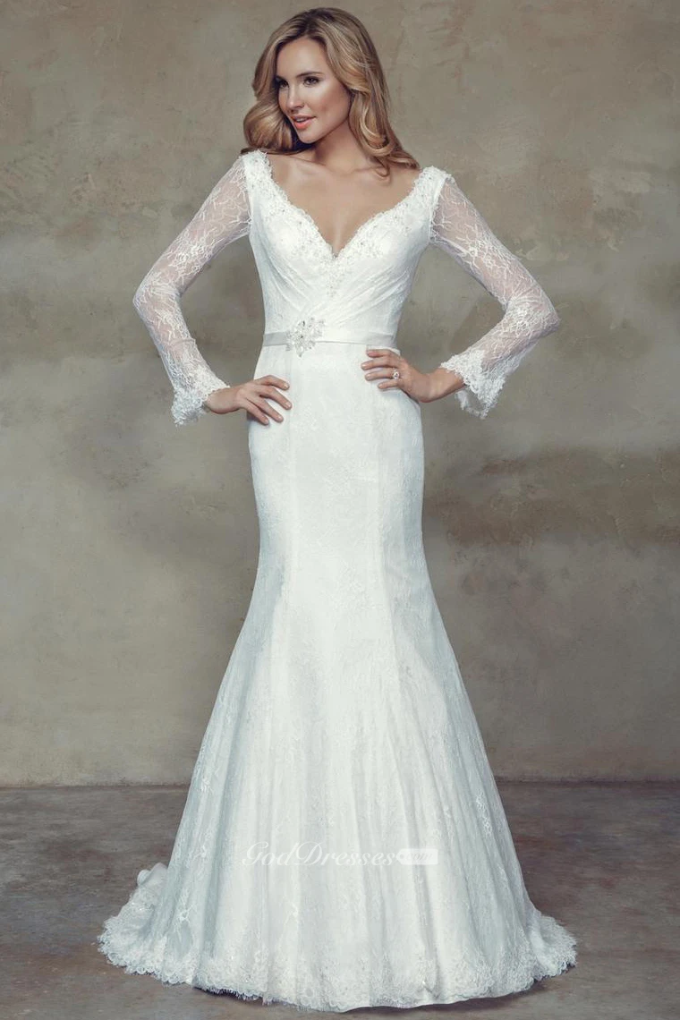 Trumpet Long-Sleeve Maxi V-Neck Lace Wedding Dress With Waist Jewellery And V Back