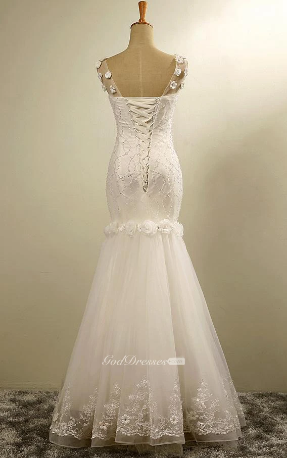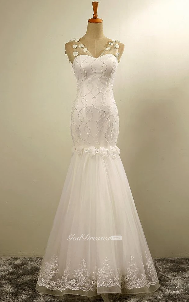 Trumpet Maxi Cap Beading Keyhole Tulle Dress