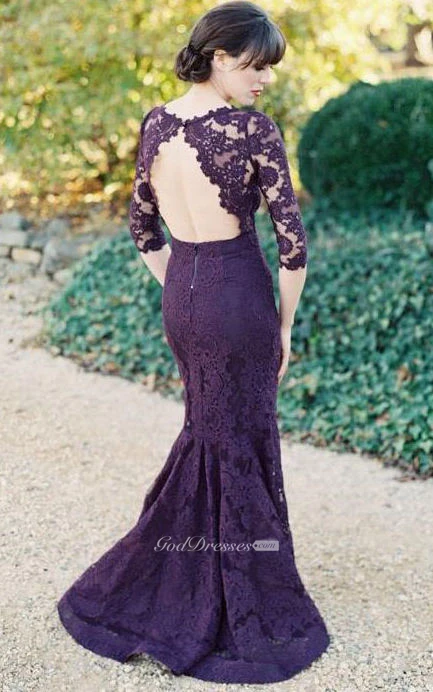 Trumpet Maxi Scoop 3-4 Sleeve Backless Lace Satin Dress