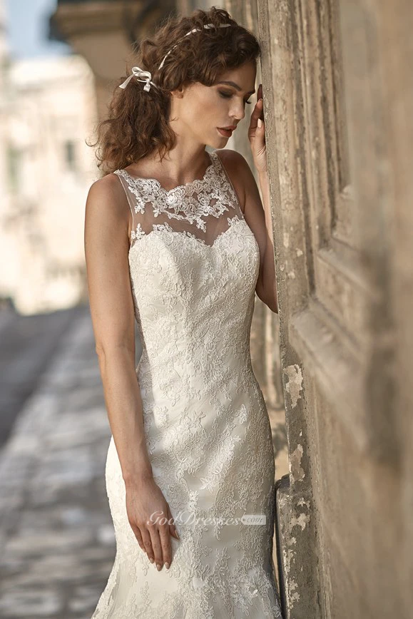 Trumpet Scoop-Neck Long Appliqued Sleeveless Lace Wedding Dress
