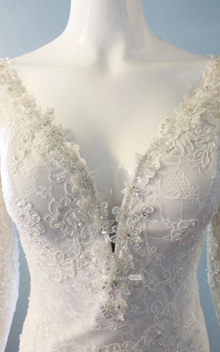Trumpet V-Neck Long Sleeve Lace Satin Dress With Beading Appliques Button