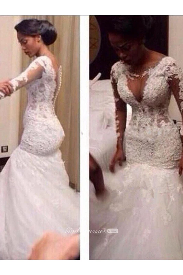 Trumpet V-neck Long Sleeves Lace Court Train Lace Tulle Wedding Dresses