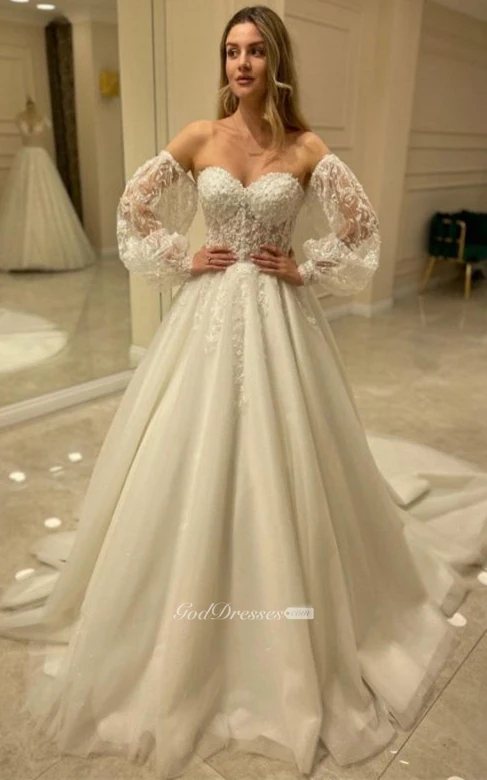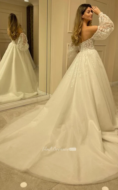 Tulle A Line Chapel Train Wedding Dress with Ruching and Appliques