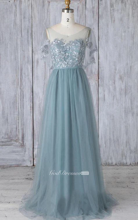 Tulle Floor-length A Line Short Sleeve Simple Formal Dress with Pleats