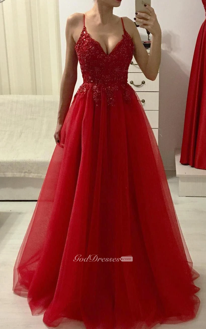 Tulle Floor-length A Line Sleeveless Romantic Prom Dress with Beading and Ruffles