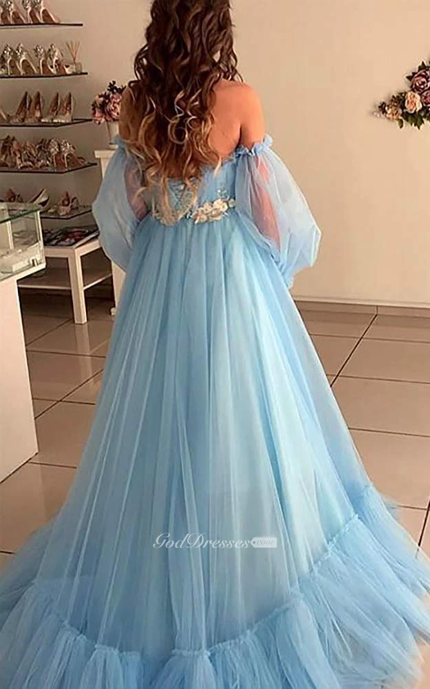 Tulle Floor-length Brush Train Ball Gown Long Sleeve Ethereal Prom Dress with Ruffles