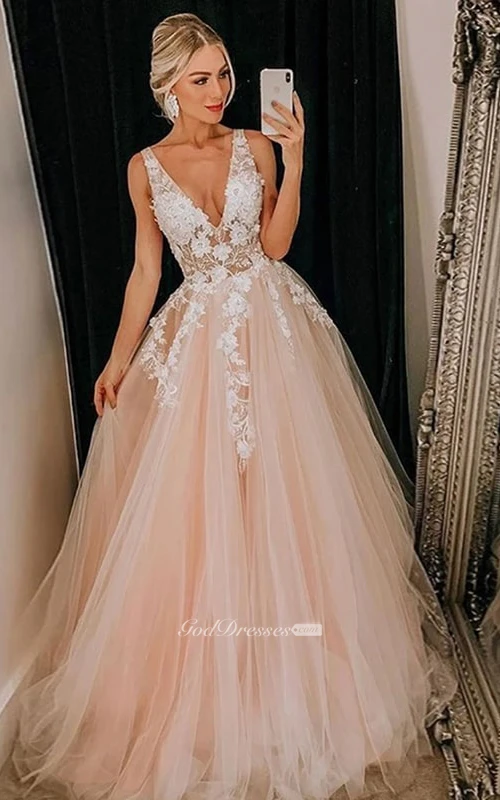 Tulle Floor-length Sweep Train A Line Sleeveless Simple Evening Dress with Flowers