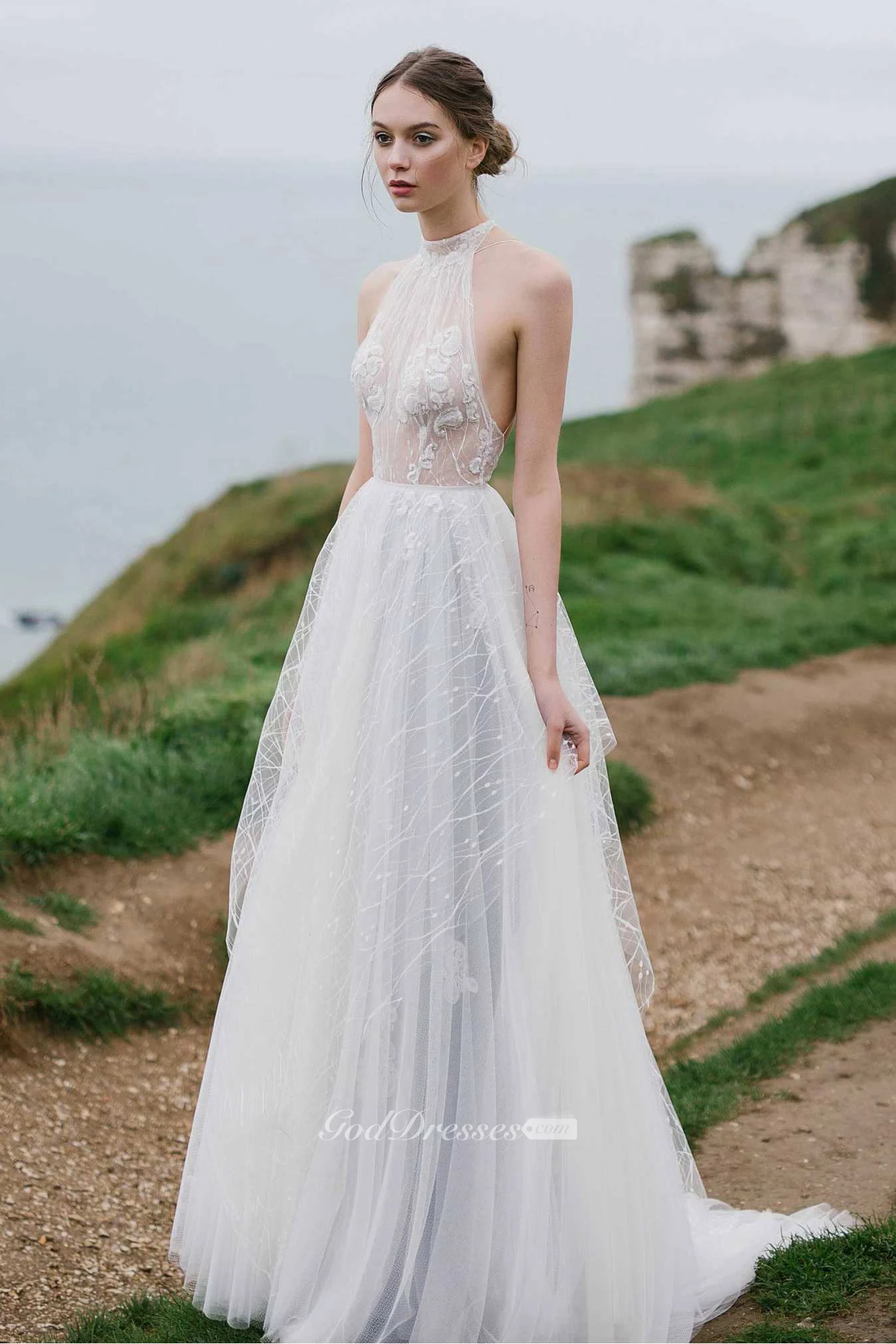 Tulle High Neck Sleeveless A-Line Dress With Appliques