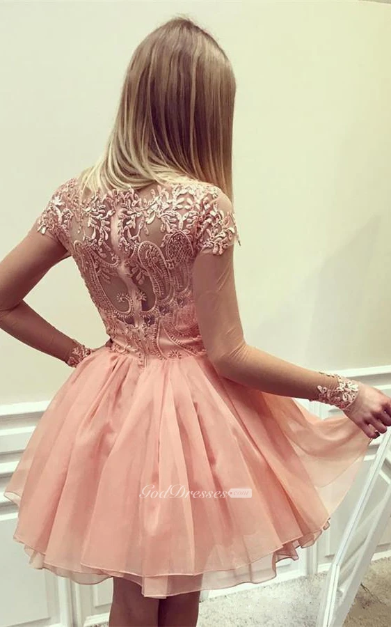 Tulle Lace Ball Gown Zipper Illusion Long Sleeve with Appliques Homecoming Dress