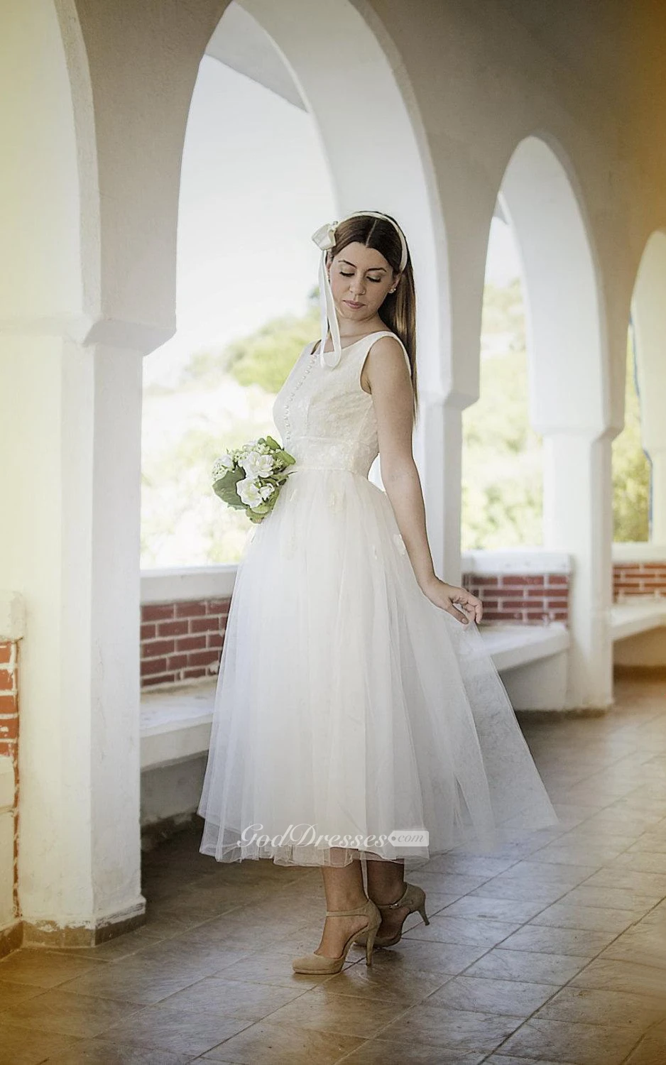 Tulle Tea Length Sleeveless Bateau Neck Dress With Beadings and Low-V Back