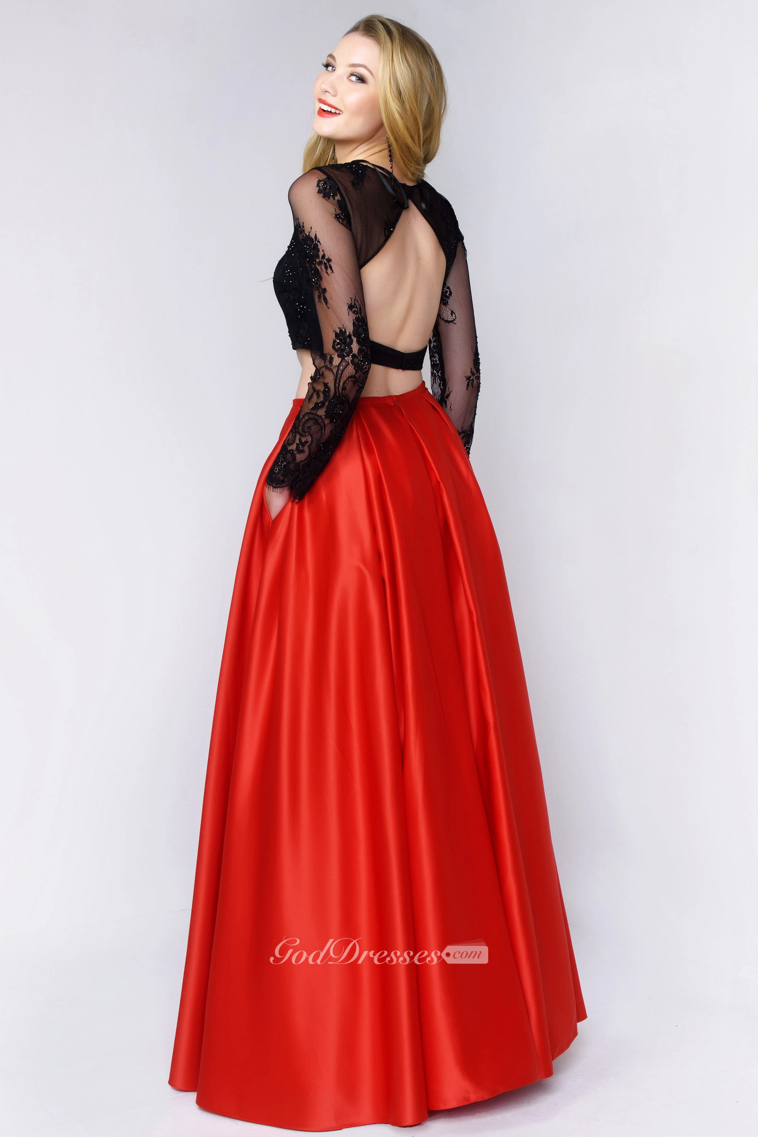 Two-Piece A-Line Scoop-Neck Long Sleeve Satin Keyhole Dress With Lace And Appliques