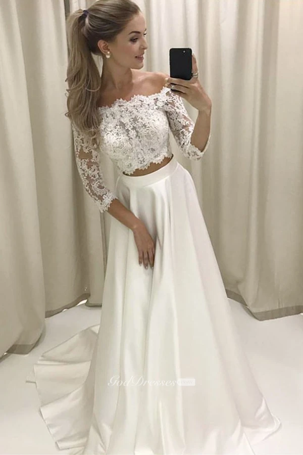 Two Piece Off-the-shoulder Sleeves Satin Wedding Dress with Lace Wedding Dresses