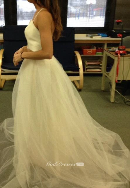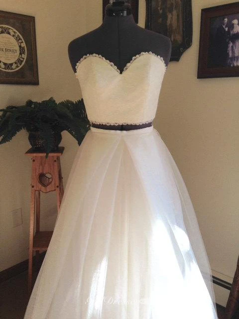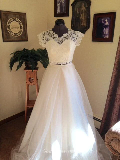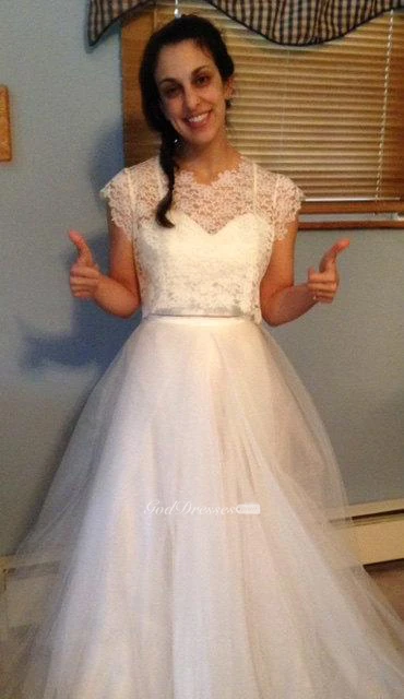 Two Piece Short Sleeve V-Neck Lace Bodice and Tulle Skirt Dress