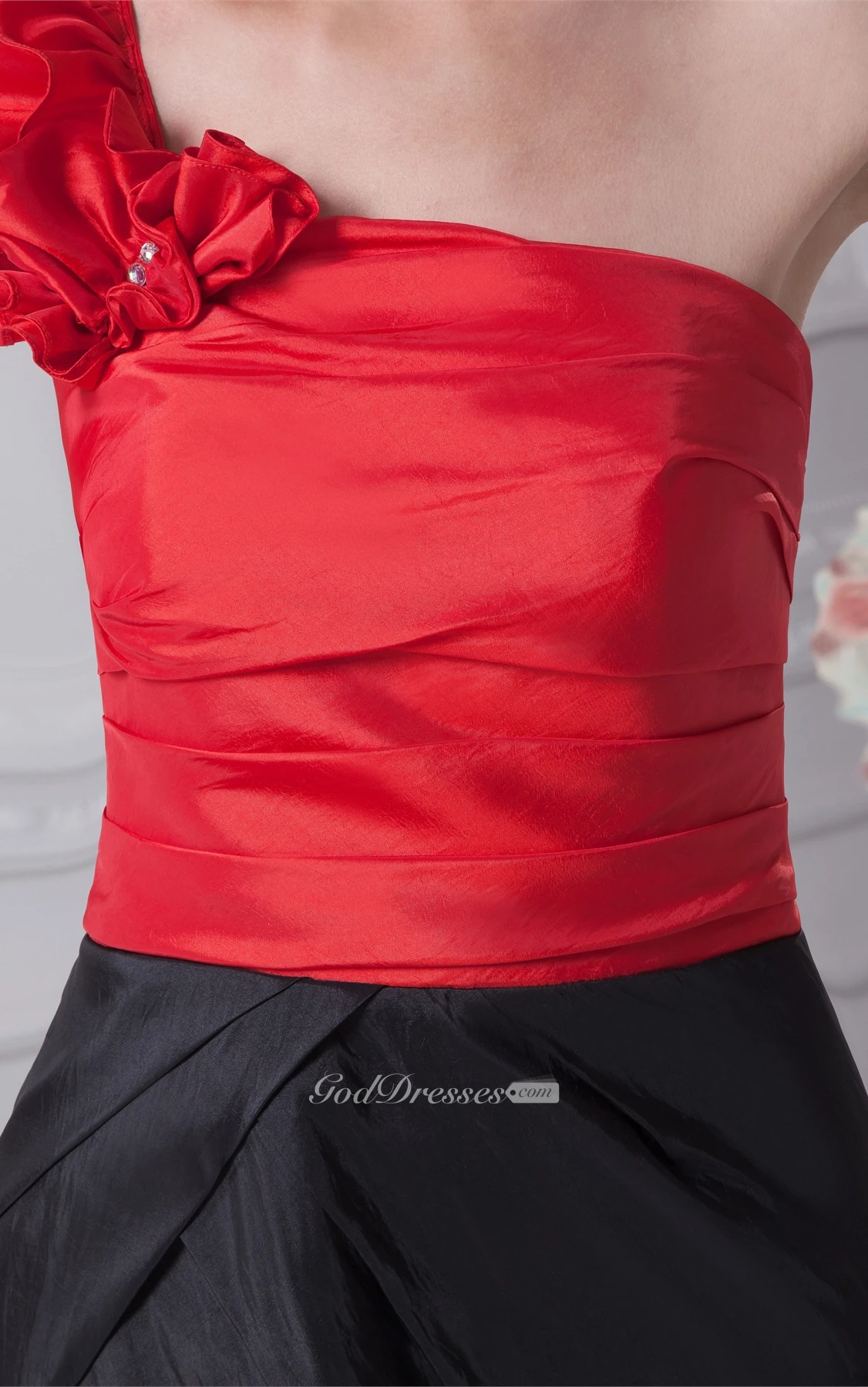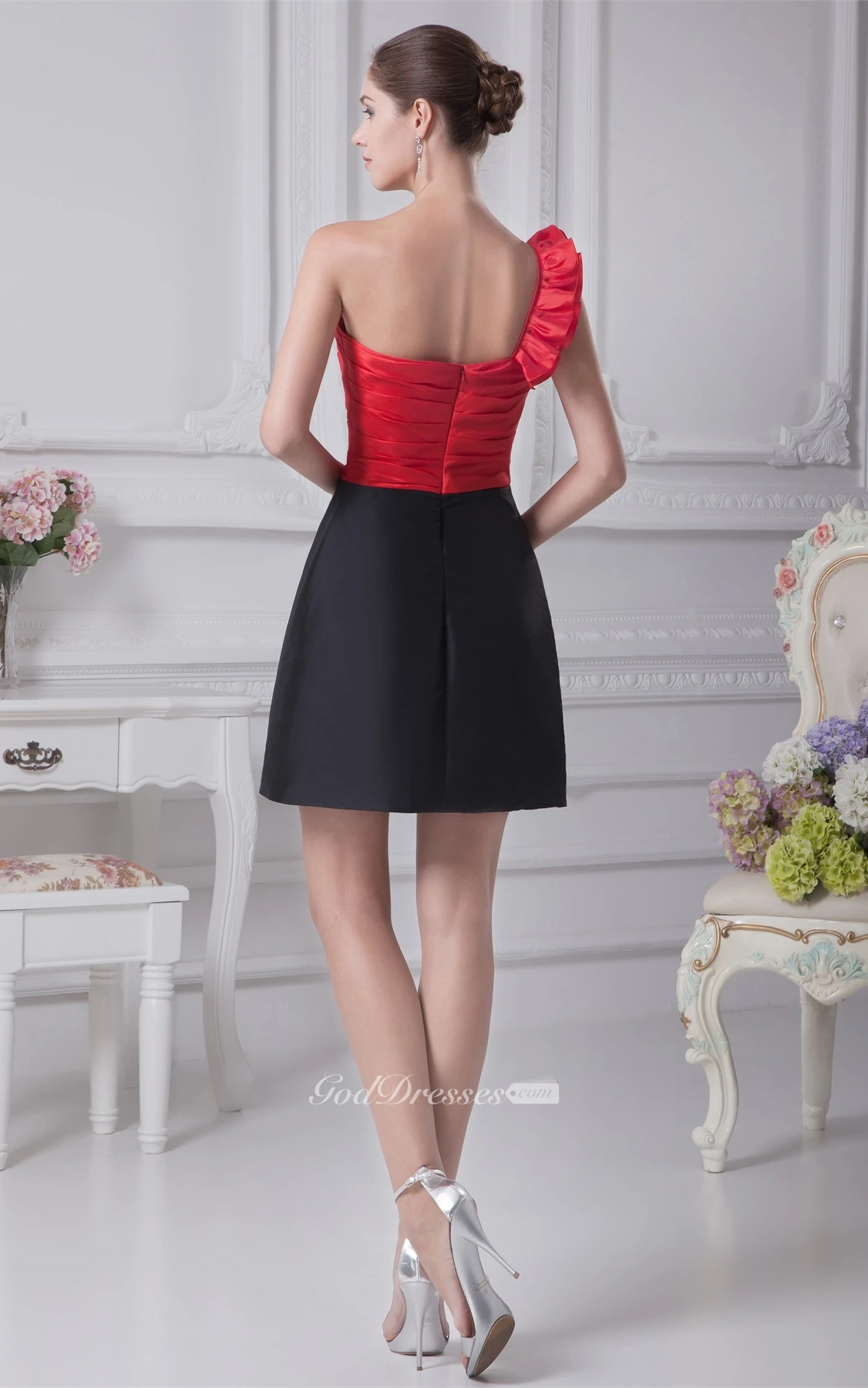 Two-Tone Satin Short One-Shoulder Dress With Ruching