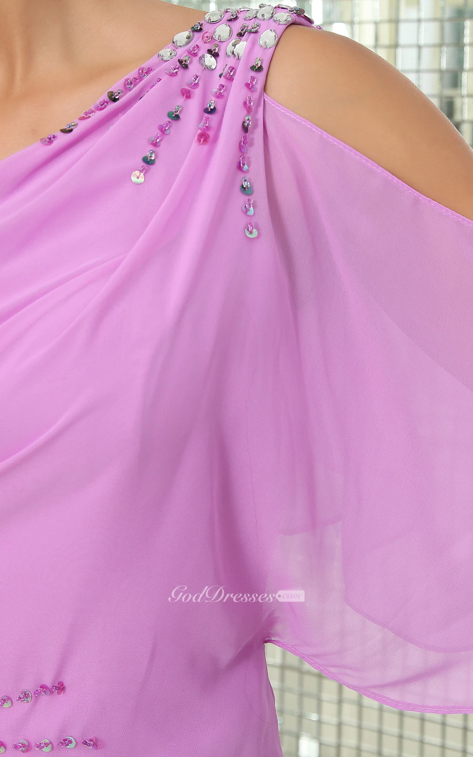 Unique Backless Sequined One-Shoulder Side Draped Chiffon Gown