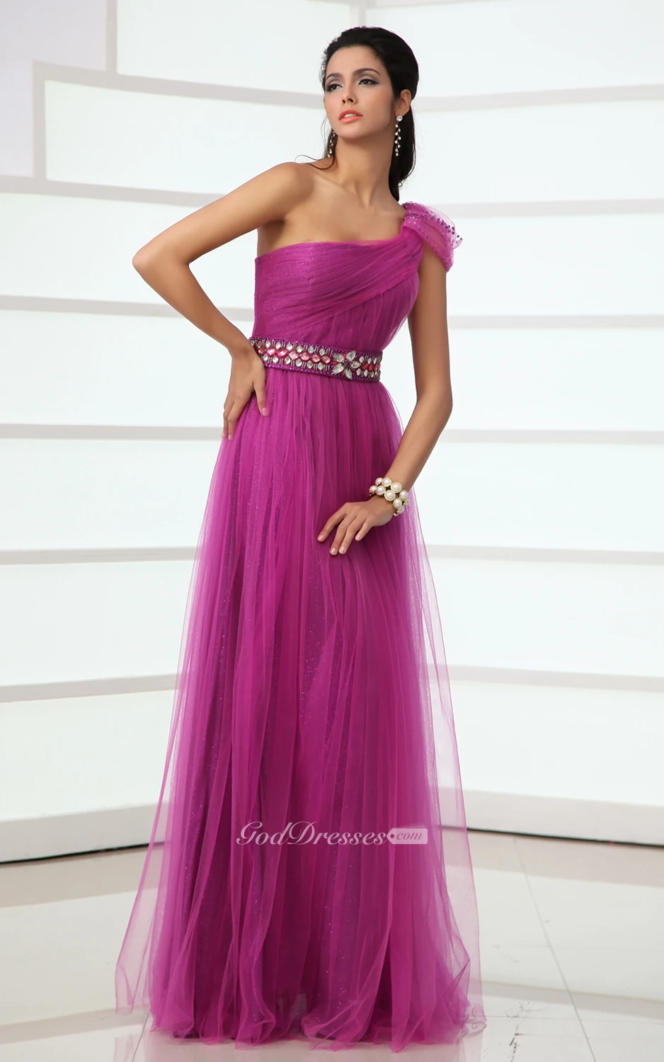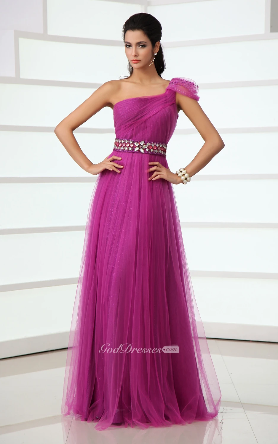 Unique One-Shoulder Tulle A-Line Gown With Crystal Sash