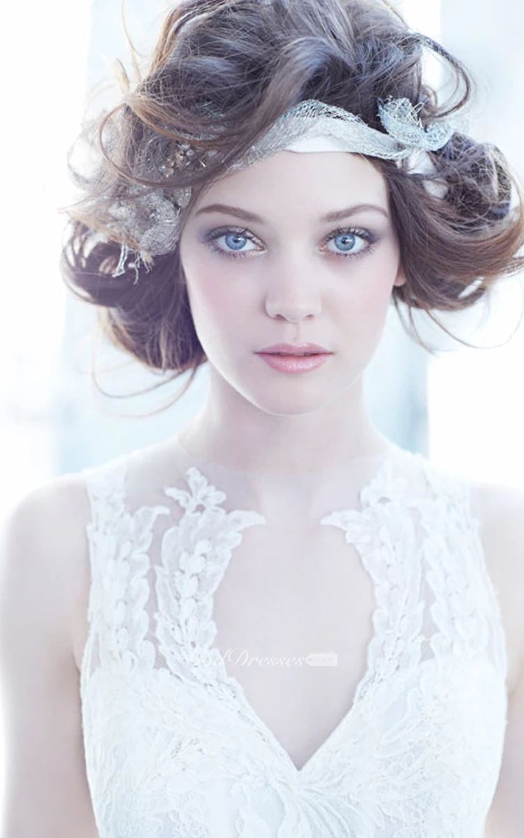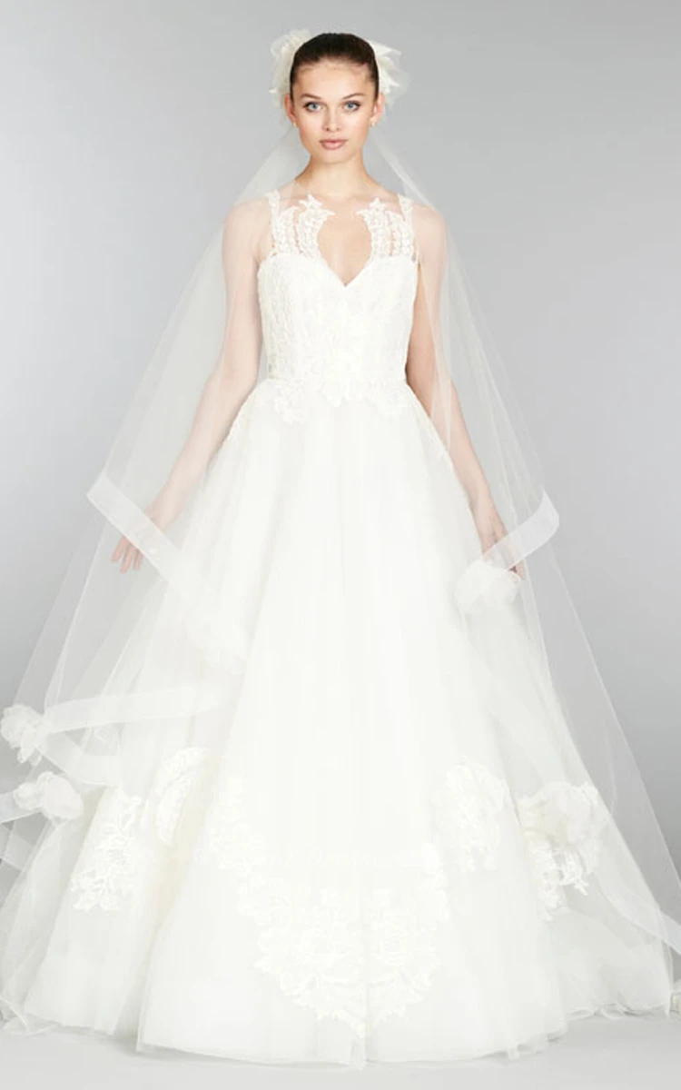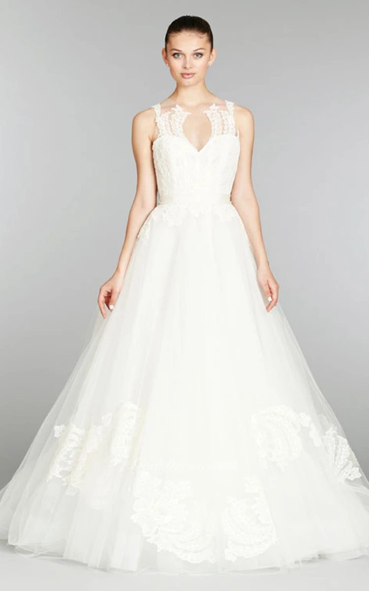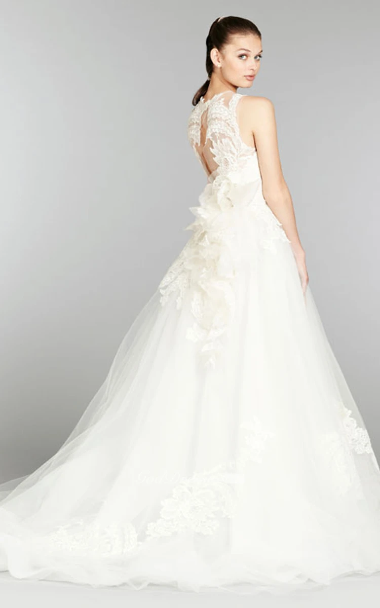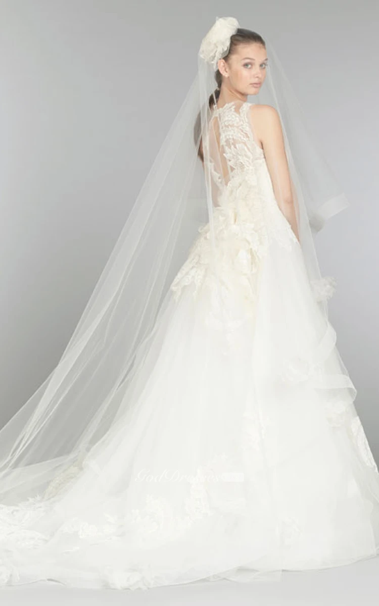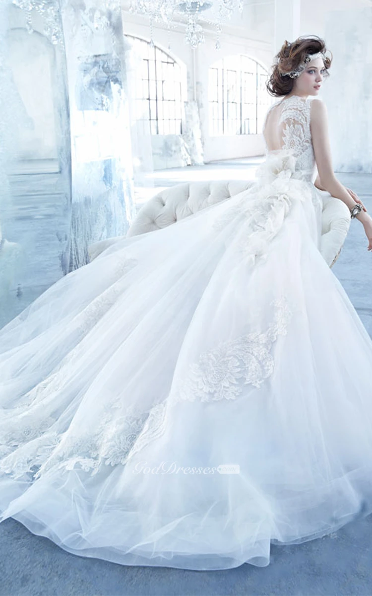 Unique Sleeveless Tulle Ball Gown With Lace Applique and Floral Corsage