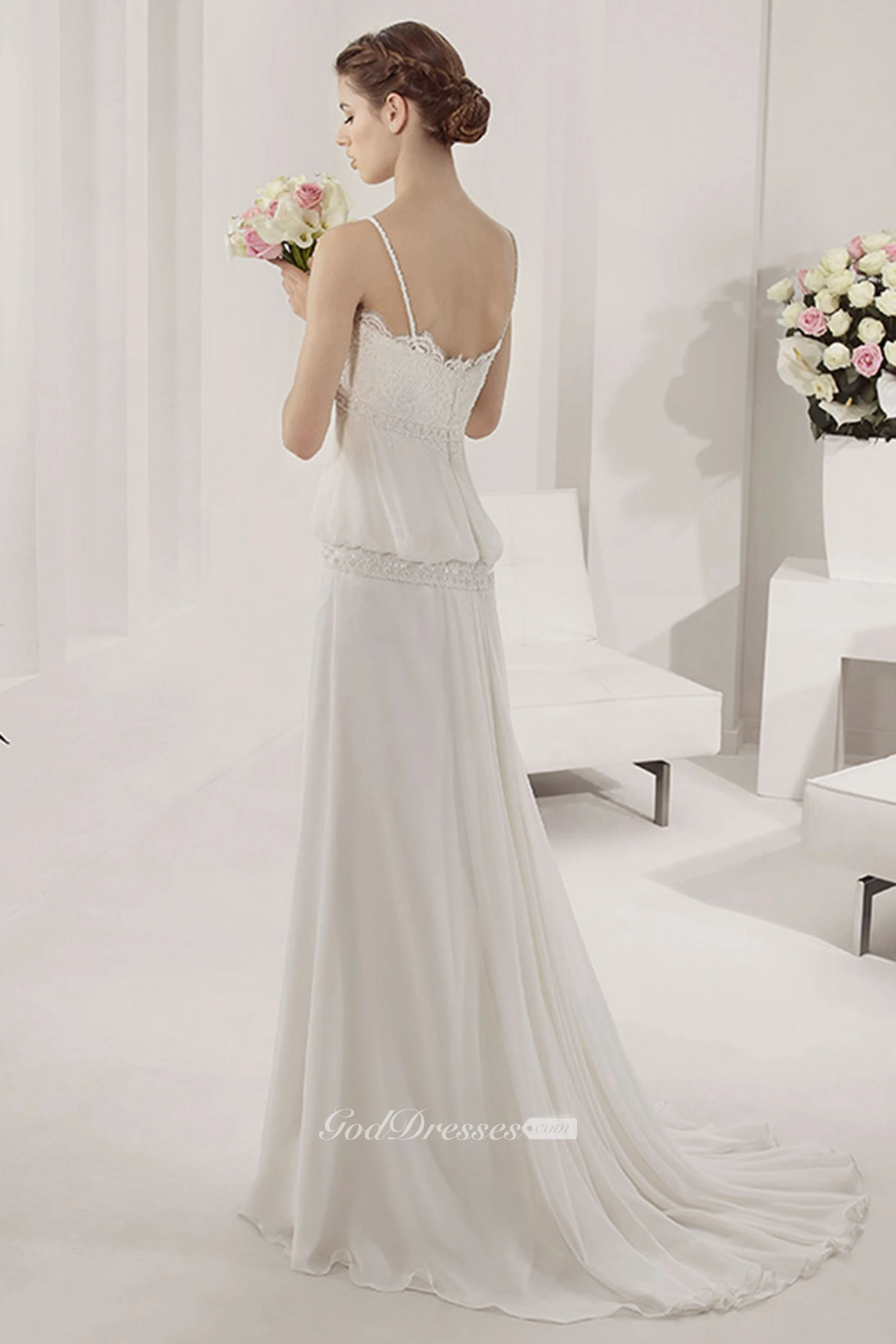 Unique Spaghetti Straps Lace Scalloped Neckline A-Line Chiffon Gown