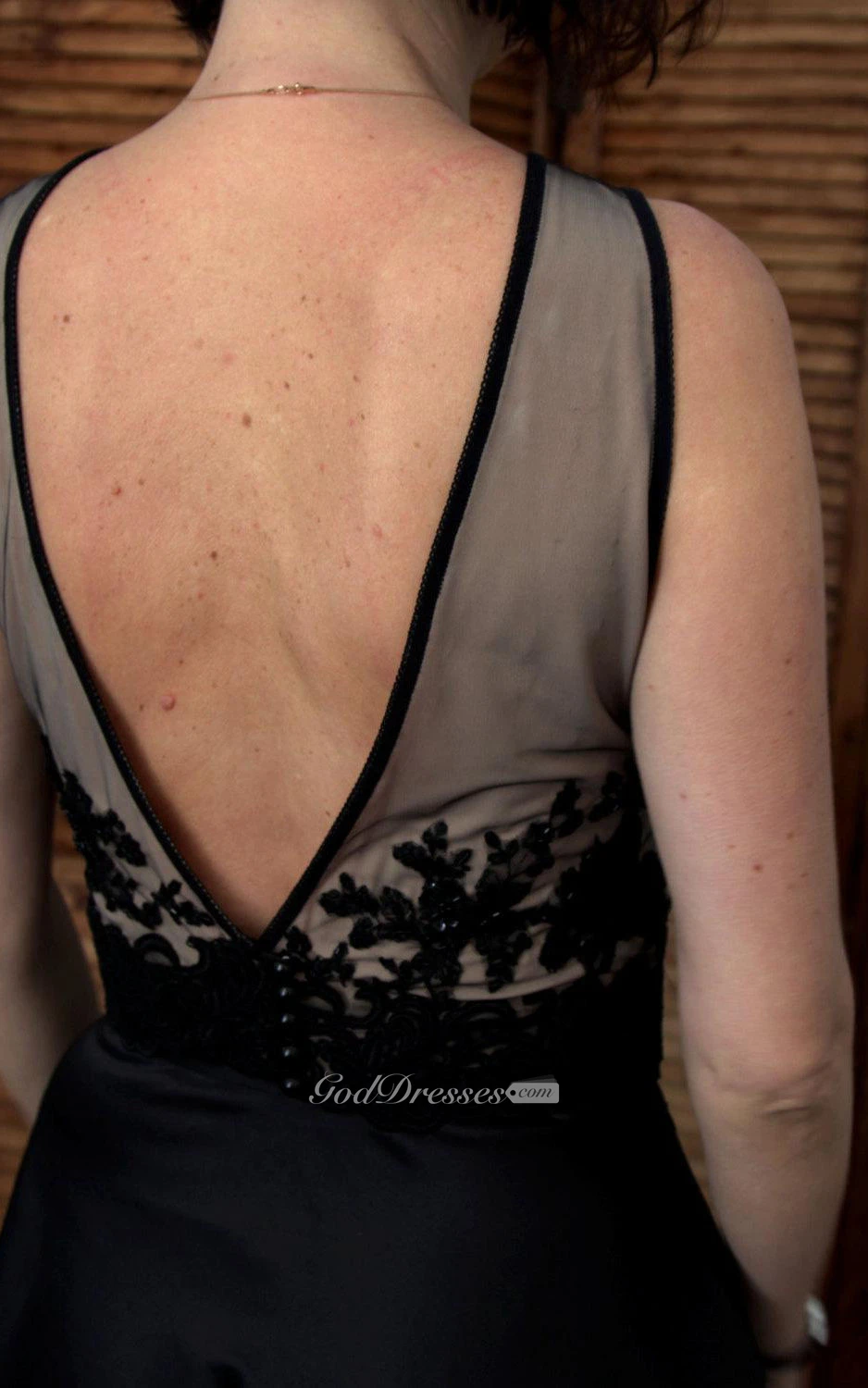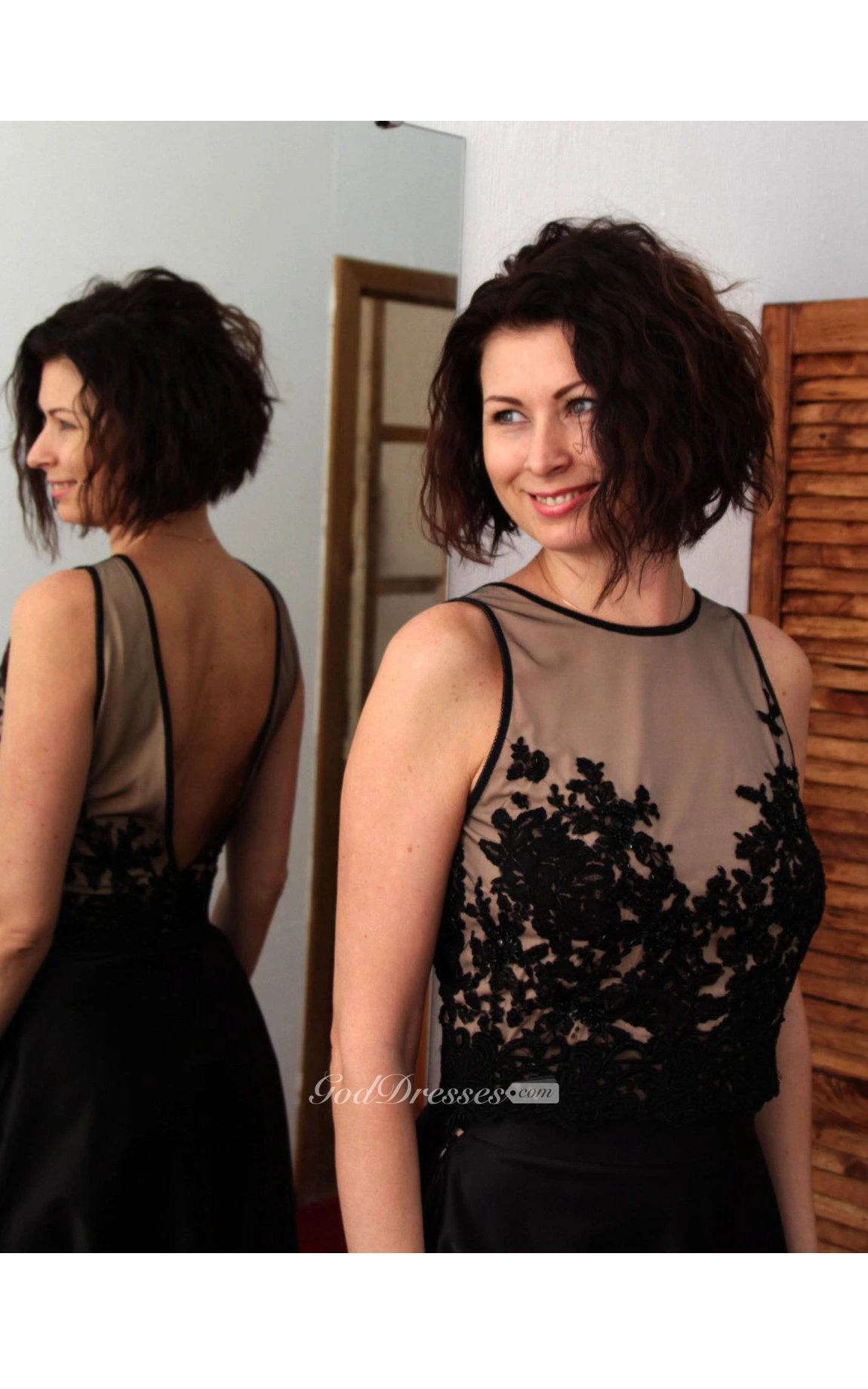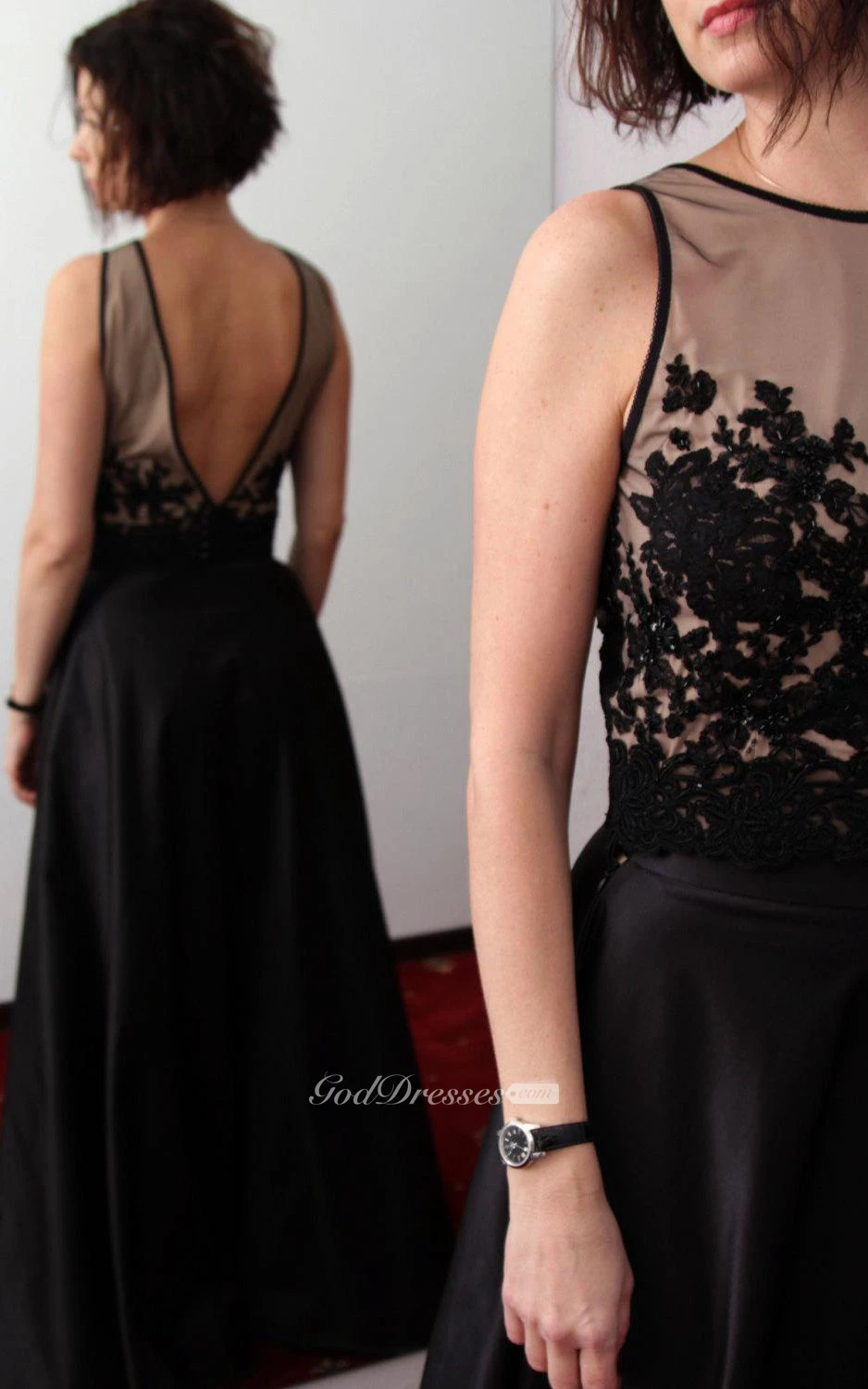 V Back High Neck Satin A-line Long Dress With Illusion Top
