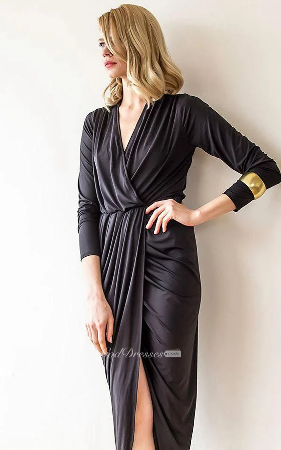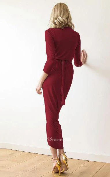 V Neck 3-4 Sleeve Sheath Jersey Tea Length Dress With Split