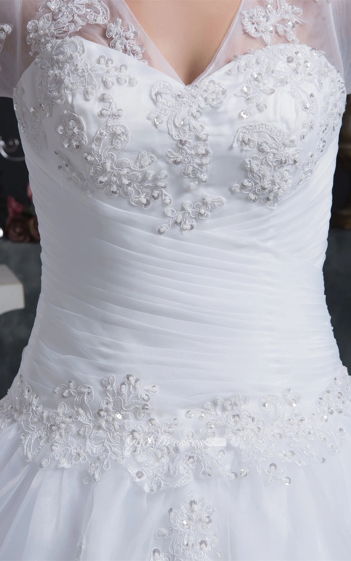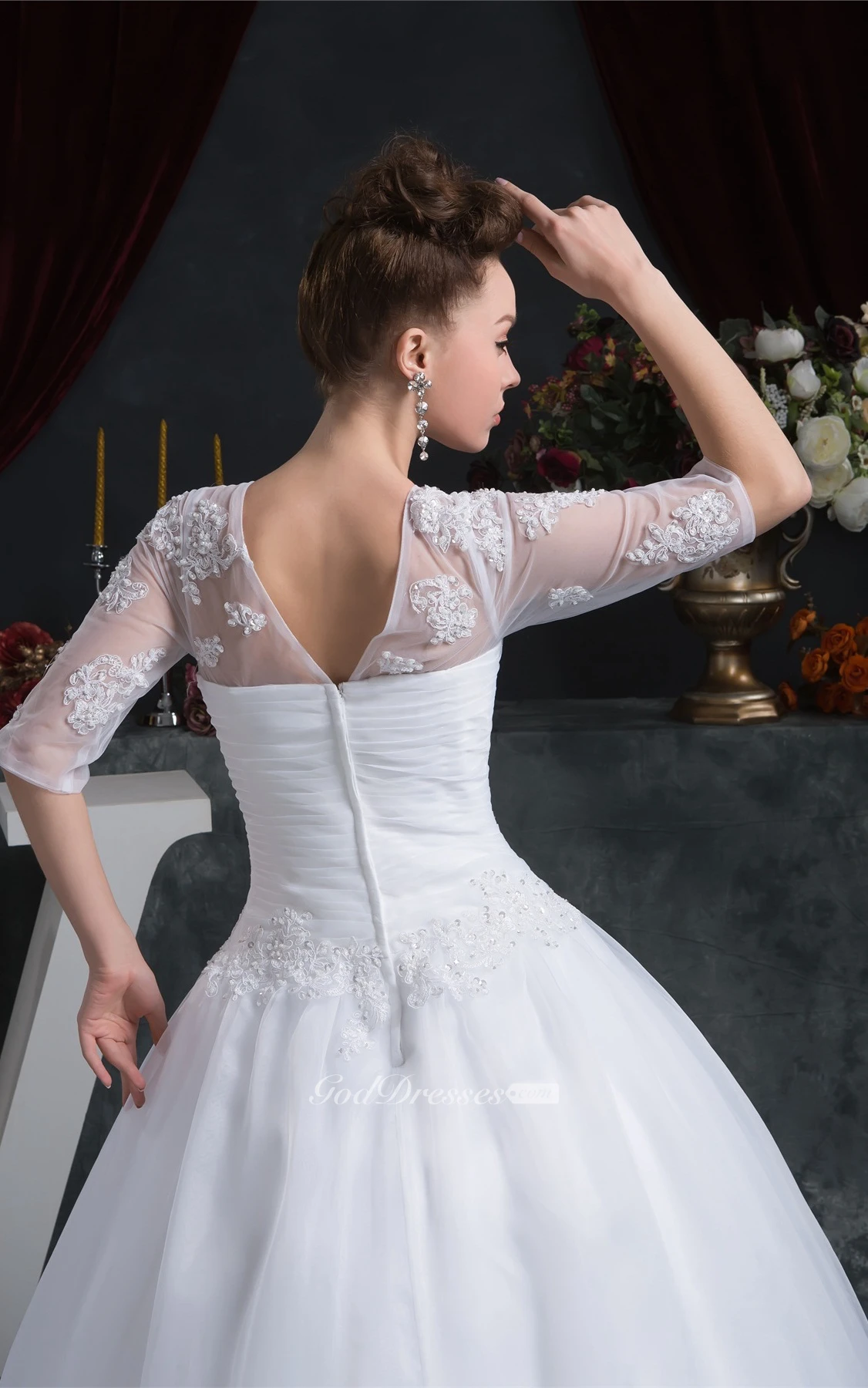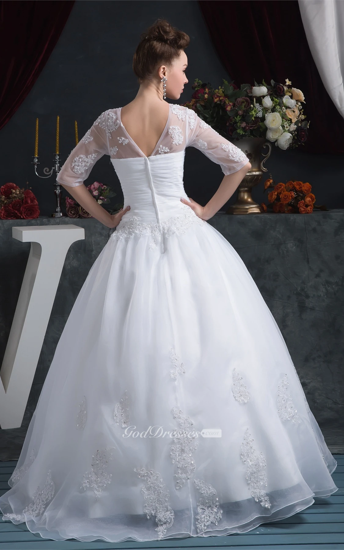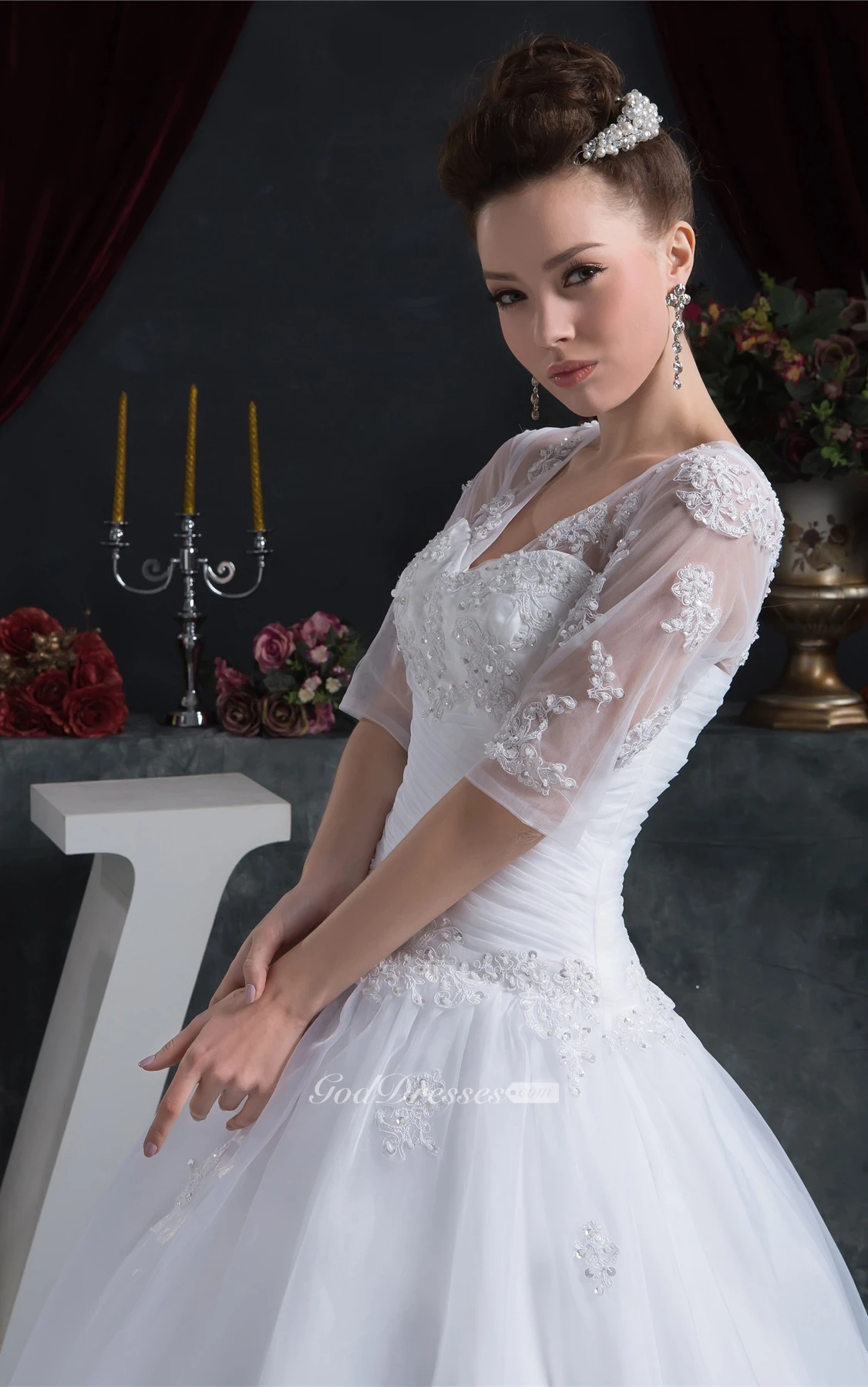 V-Neck A-Line Appliqued Illusion Half Sleeve and Gown With Ruching