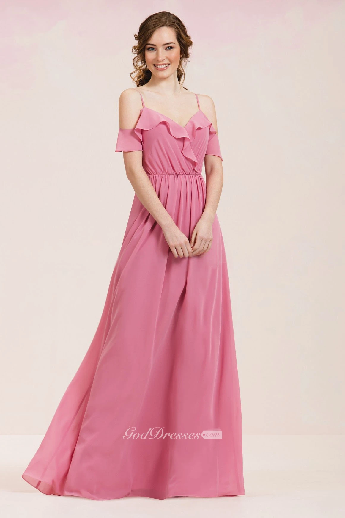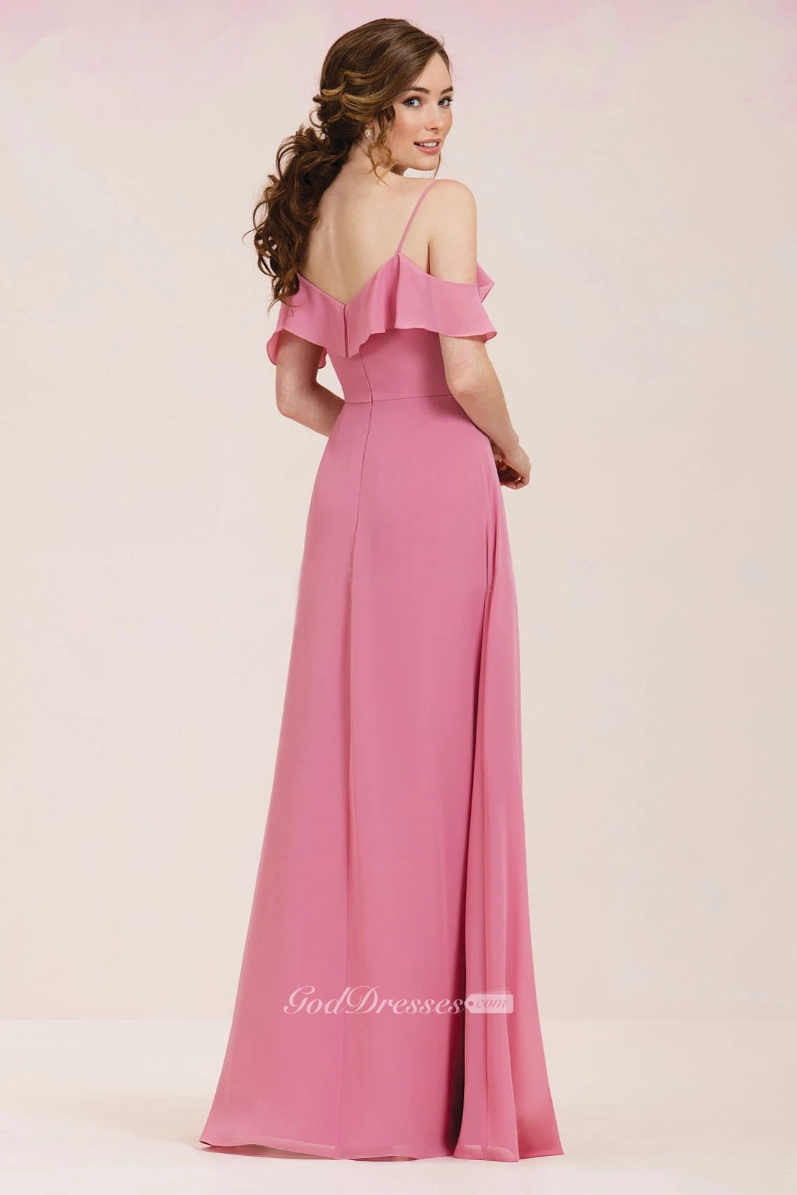 V-Neck A-Line Long Bridesmaid Dress With Ruffles And Spaghetti Straps