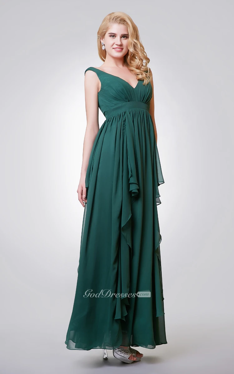 You’ll look beautiful attending an upcoming wedding in this v-neck a-line tiered long chiffon dress. The modern a-line silhouette is accented by a fitted waistline and a floor-length layered tiered chiffon skirt. A deep v-neckline is complemented by delicate ruching across the bodice of the gown. An open back completes the look for a truly elegant gown that’s perfect for any special occasion.