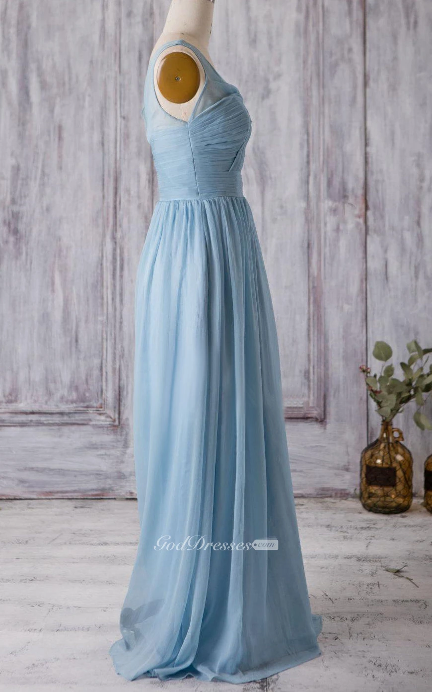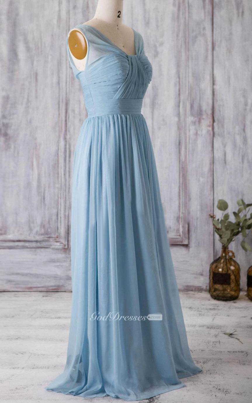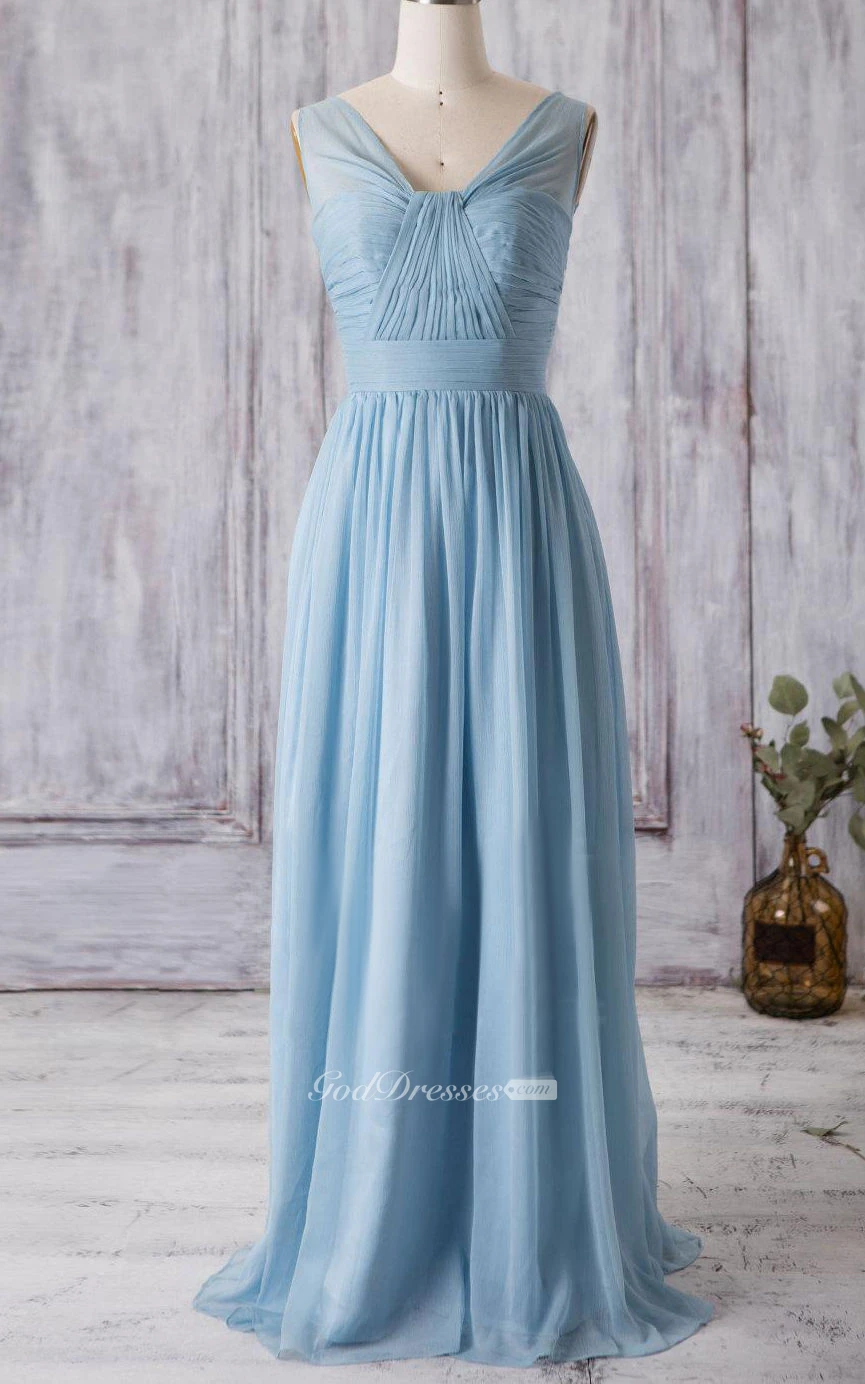 V Neck A-line Pleated Chiffon Floor Length Dress With Bandage