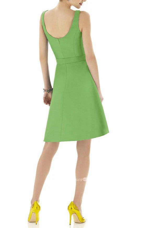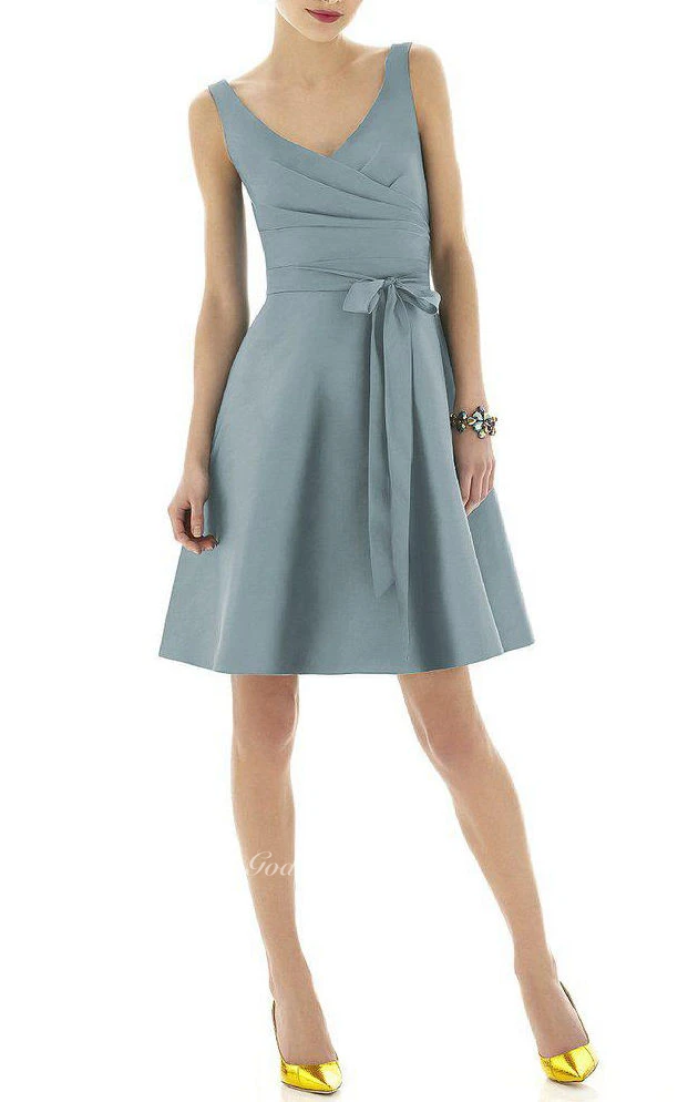 V-neck A-line Pleated Satin Short Dress with Sash