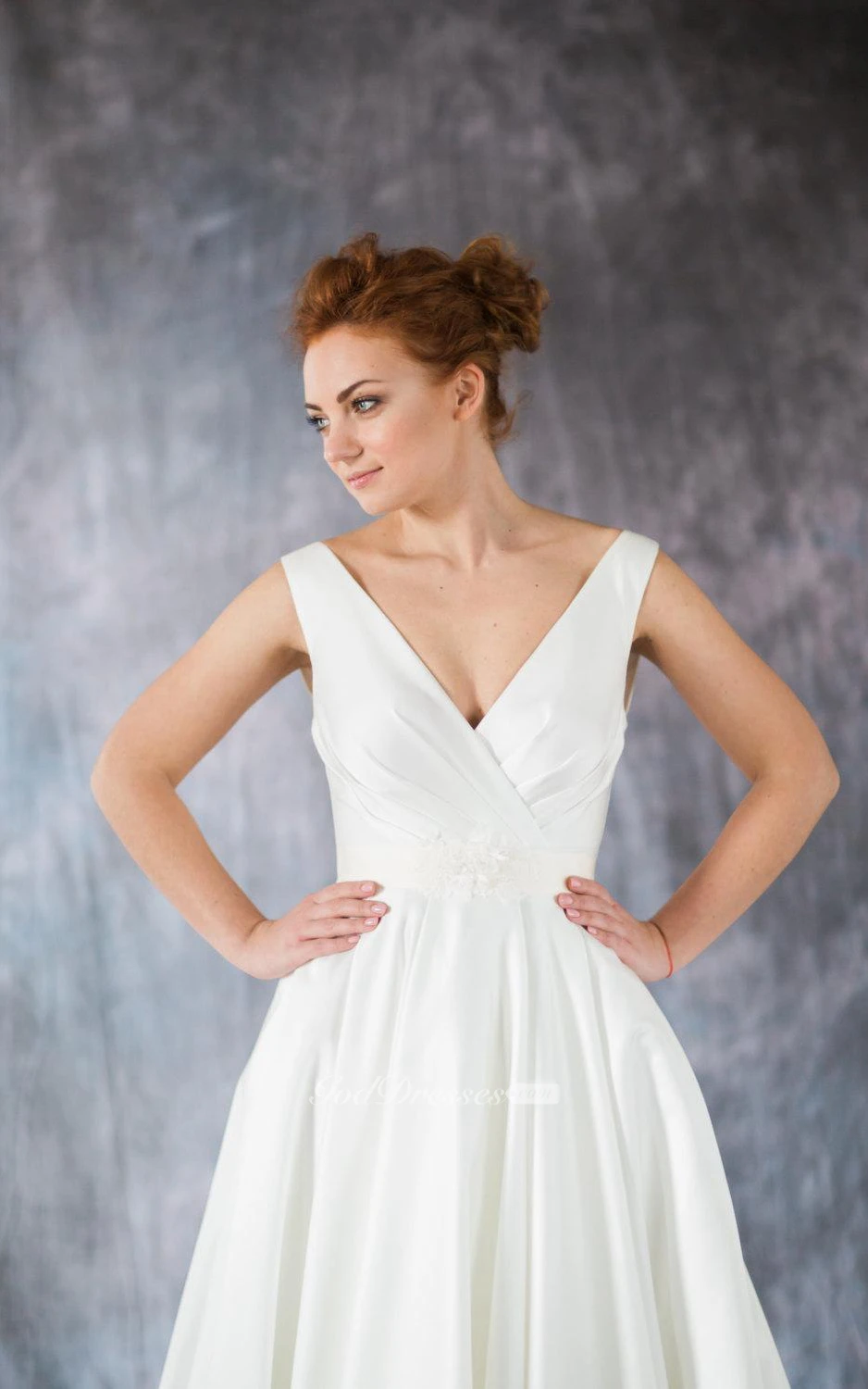 V-Neck A-Line Satin Dress With Low-V Back and Pleats